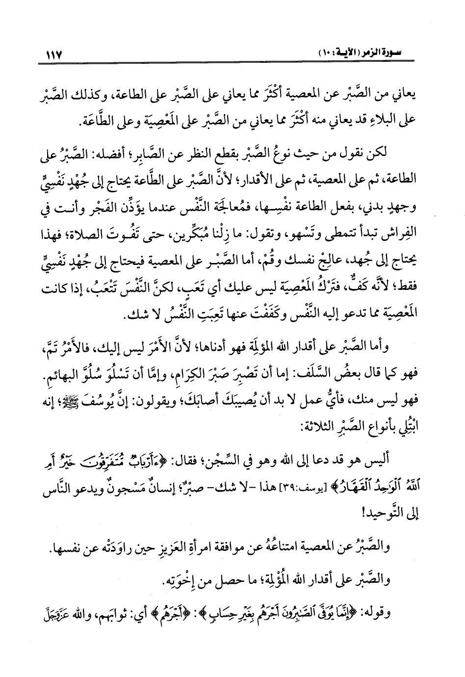 لكن نقول من حيث نوعُ الصَّبْر بقطع النظر عن الصَّابِر؛ أفضله: الصَّبْرُ على الطاعة، ثم على المعصية، ثم على الأقدار؛ لأنَّ الصَّبْر على الطَّاعة يحتاج إلى جُهْدٍ نَفْسِيٍّ وجهدٍ بدني، بفعل الطاعة نفْسِها، فمُعالَجَة النَّفْس عندما يؤَذِّن الفَجْر وأنت في الفِراش تبدأ تتمطى وتَسْهو، وتقول: ما زِلْنا مُبَكِّرين، حتى تَفُوتَ الصلاة؛ فهذا يحتاج إلى جُهد، عالِجْ نفسك وقُمْ، أما الصَّبْر على المعصية فيحتاج إلى جُهْدٍ نَفْسِيٍّ فقط؛ لأنَّه كَفٌّ، فتَرْكُ المَعْصِيَة ليس عليك أي تَعَبٍ، لكنَّ النَّفْسَ تَتْعَبُ، إذا كانت المَعْصِيَة مما تدعو إليه النَّفْس وكَفَفْتَ عنها تَعِبَتِ النَّفْسُ لا شك.