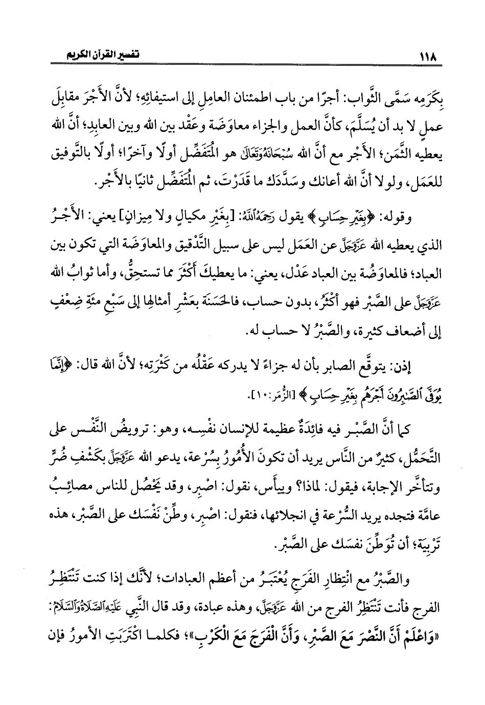 وقوله: {بِغَيْرِ حِسَابٍ} يقول رَحِمَهُ اللهُ: [بِغَيْرِ مكيالٍ ولا مِيزانٍ] يعني: الأَجْرُ الذي يعطيه الله عَزَّ وَجَلَّ عن العَمَل ليس على سبيل التَّدْقيق والمعاوَضَة التي تكون بين العباد؛ فالمعاوَضةُ بين العباد عَدْل، يعني: ما يعطيكَ أَكْثَرَ مما تستحِقُّ، وأما ثوابُ الله عَزَّ وَجَلَّ على الصَّبْر فهو أكْثَرُ، بدون حساب، فالحَسَنَة بعَشْرِ أمثالِها إلى سَبْعِ مئَةِ ضِعْفٍ إلى أضعاف كثيرة، والصَّبْرُ لا حساب له.