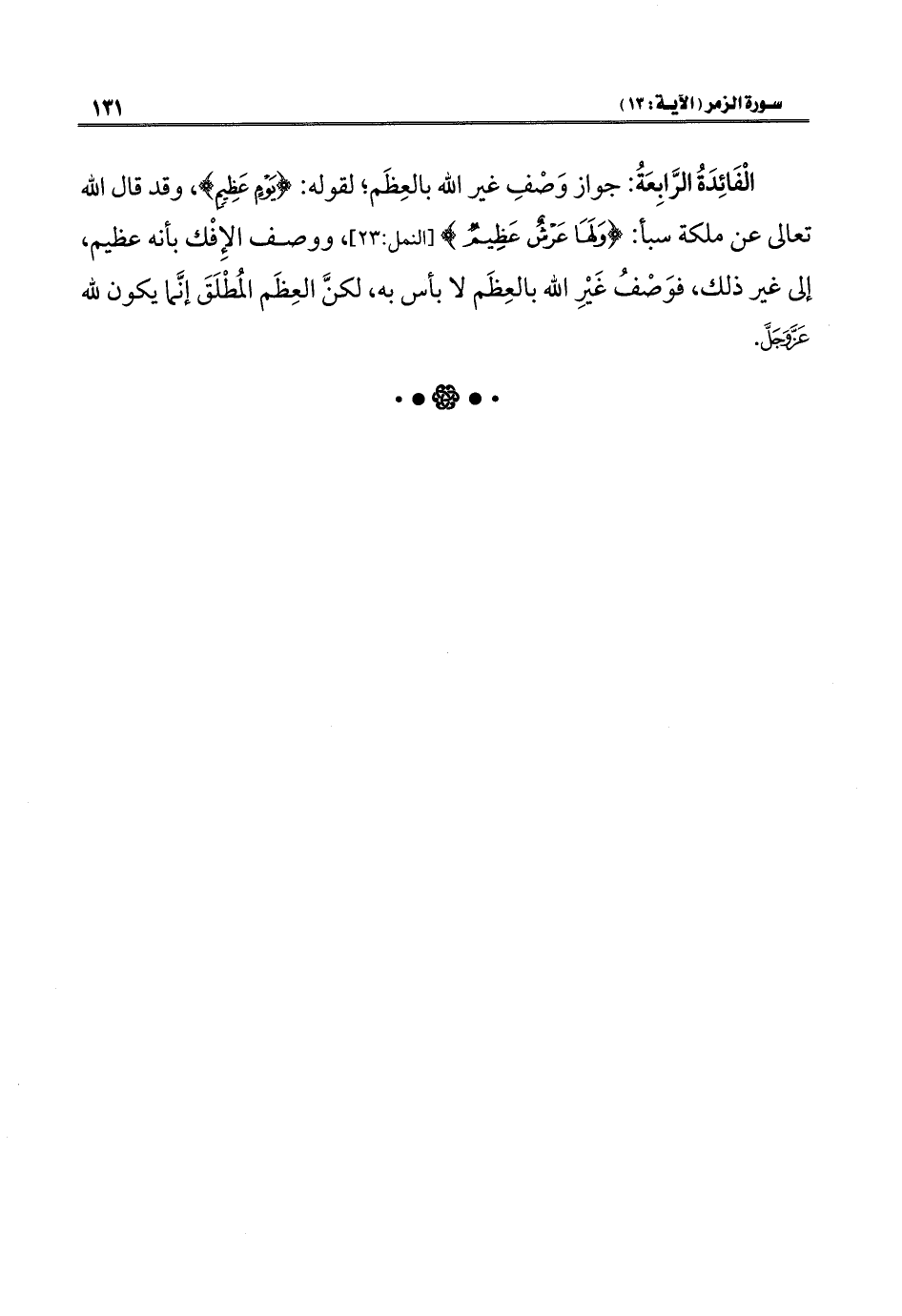 الْفَائِدَةُ الرَّابِعَةُ: جواز وَصْفِ غير الله بالعِظَم؛ لقوله: {يَوْمٍ عَظِيمٍ}، وقد قال الله تعالى عن ملكة سبأ: {وَلَهَا عَرْشٌ عَظِيمٌ} [النمل: ٢٣]، ووصف الإِفْك بأنه عظيم، إلى غير ذلك، فوَصْفُ غَيْرِ الله بالعِظَم لا بأس به، لكنَّ العِظَم المُطْلَقَ إنَّما يكون لله عَزَّ وَجَلَّ.