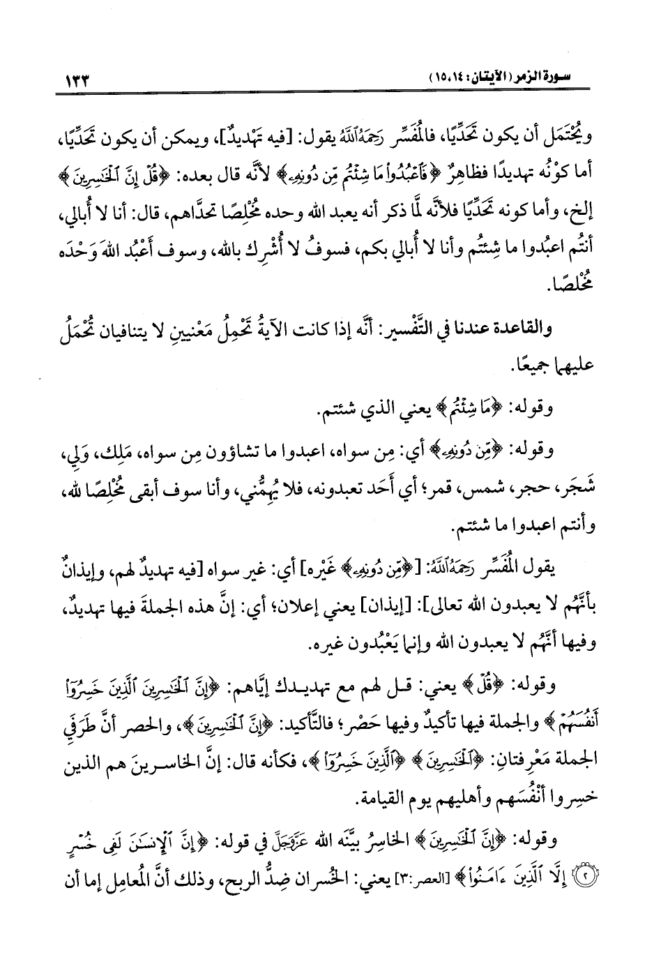 ويُحْتَمَل أن يكون تحَدِّيًا، فالمُفَسِّر رَحِمَهُ اللهُ يقول: [فيه تَهْديدٌ]، ويمكن أن يكون تحَدِّيًا، أما كوْنُه تهديدًا فظاهِرٌ {فَاعْبُدُوا مَا شِئْتُمْ مِنْ دُونِهِ} لأنَّه قال بعده: {قُلْ إِنَّ الْخَاسِرِينَ} إلخ، وأما كونه تَحَدِّيًا فلأنَّه لمَّا ذكر أنه يعبد الله وحده مُخْلِصًا تحدَّاهم، قال: أنا لا أُبالي، أنتُم اعبُدوا ما شِئتُم وأنا لا أُبالي بكم، فسوف لا أُشْرِك بالله، وسوف أَعْبُد اللهَ وَحْدَه مُخْلصًا.