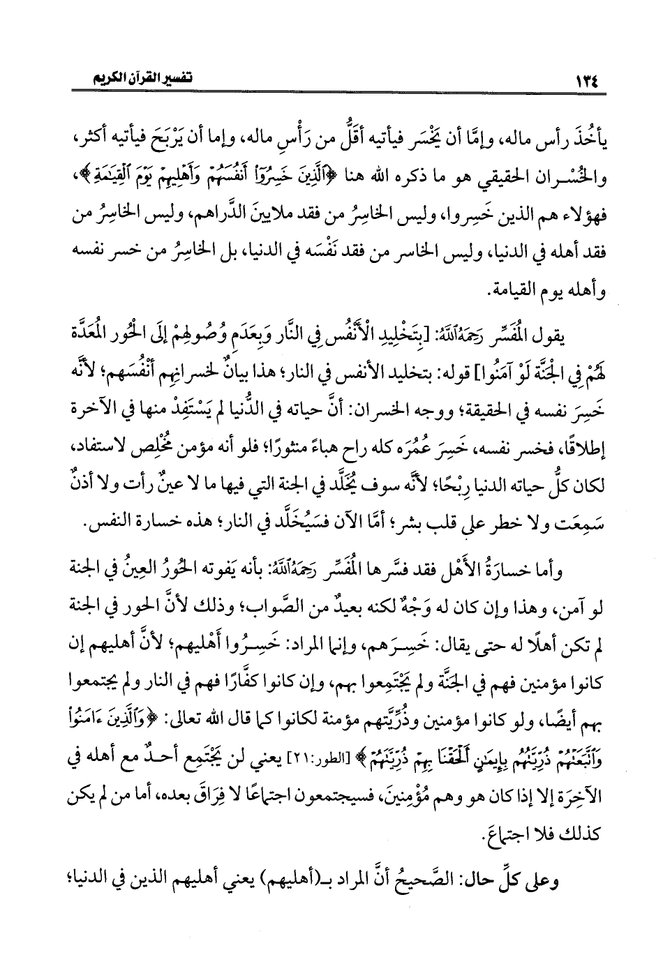 يأخُذَ رأس ماله، وإمَّا أن يَخْسَر فيأتيه أقَلُّ من رَأْسِ ماله، وإما أن يَرْبَحَ فيأتيه أكثر، والخُسْران الحقيقي هو ما ذكره الله هنا {الَّذِينَ خَسِرُوا أَنْفُسَهُمْ وَأَهْلِيهِمْ يَوْمَ الْقِيَامَةِ}، فهؤلاء هم الذين خَسِروا، وليس الخاسِرُ من فقد ملايينَ الدَّراهم، وليس الخاسِرُ من فقد أهله في الدنيا، وليس الخاسر من فقد نَفْسَه في الدنيا، بل الخاسِرُ من خسر نفسه وأهله يوم القيامة.