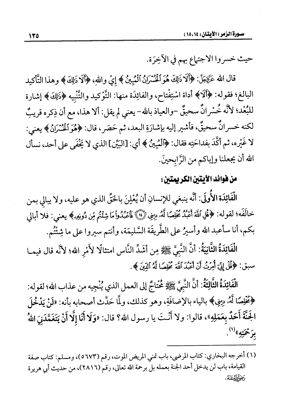 الْفَائِدَةُ الثَّالِثَةُ: أنَّ النَّبِيَّ - صلى الله عليه وسلم - مُحْتاجٌ إلى العمل الذي يُنْجِيه من عذاب الله؛ لقوله: {مُخْلِصًا لَهُ دِينِي} بالياء بالإضافَةِ، وهو كذلك، ولمَّا حَدَّث أصحابه بأنه: "لَنْ يَدْخُلَ الجَنَّةَ أَحَدٌ بِعَمَلِهِ"، قالوا: ولا أَنْتَ يا رسول الله؟ قال: "وَلَا أَنَا إِلَّا أَنْ يَتَغَمَّدَنِيَ اللهُ بِرَحْمَتِهِ" (١).