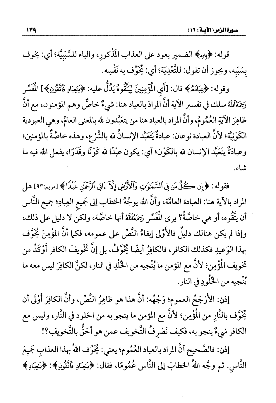 وقوله: {عِبَادَهُ} قال: [أَيِ المُؤْمِنِينَ لِيَتَّقُوهُ يَدُلُّ عليه: {يَاعِبَادِ فَاتَّقُونِ}] المُفَسِّر رَحِمَهُ اللهُ سلك في تفسير الآية أنَّ المرادَ بالعباد هنا: شيءٌ خاصٌّ وهم المؤمنون، مع أنَّ ظاهِرَ الآيَةِ العُمُومُ، وأنَّ المراد بالعباد هنا من يتعَبَّدون لله بالمعنى العامِّ، وهي العبودية الكَوْنِيَّة؛ لأنَّ العبادة نوعان: عبادةٌ يَتَعَبَّد الإنسانُ لله بالشَّرْع، وهذه خاصَّةٌ بالمؤمنين؛ وعبادَةٌ يتَعَبَّد الإنسان لله بالكَوْن، أي: يكون عبْدًا لله كَوْنًا وقَدَرًا، يفعل الله فيه ما شاء.