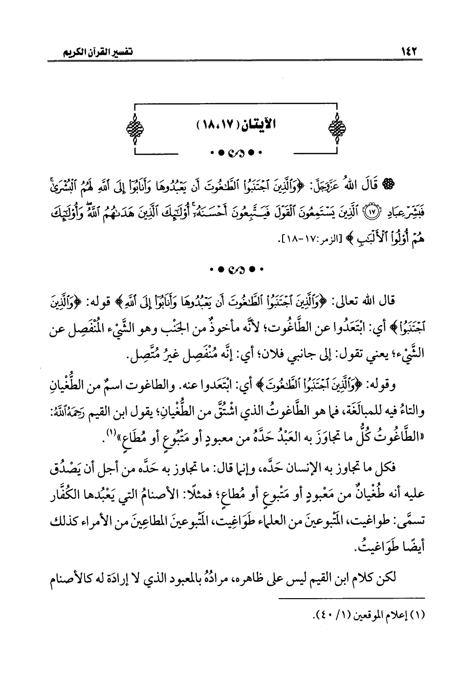 قال الله تعالى: {وَالَّذِينَ اجْتَنَبُوا الطَّاغُوتَ أَنْ يَعْبُدُوهَا وَأَنَابُوا إِلَى اللَّهِ} قوله: {وَالَّذِينَ اجْتَنَبُوا} أي: ابْتَعَدُوا عن الطَّاغُوت؛ لأنَّه مأخوذٌ من الجَنْب وهو الشَّيْء المُنْفَصِل عن الشَّيْء؛ يعني تقول: إلى جانبي فلان؛ أي: إنَّه مُنْفَصِل غيرُ مُتَّصِل.