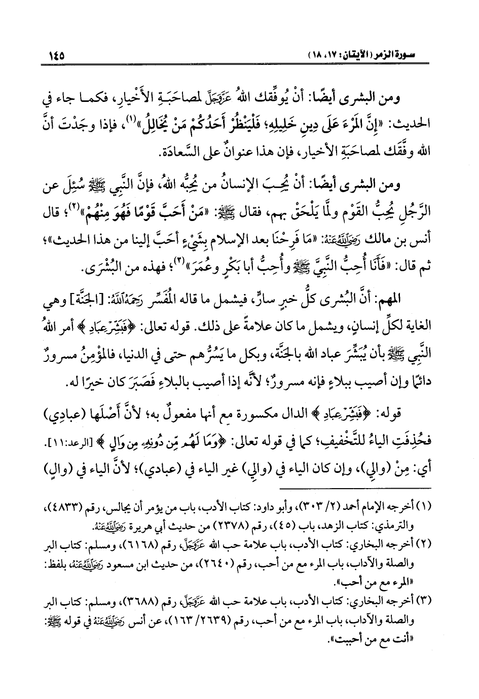 المهم: أنَّ البُشرى كلُّ خبرٍ سارٍّ، فيشمل ما قاله المُفَسِّر رَحِمَهُ اللهُ: [الجَنَّة] وهي الغاية لكلِّ إنسانٍ، ويشمل ما كان علامةً على ذلك. قوله تعالى: {فَبَشِّرْ عِبَادِ} أمر اللهُ النَّبِي - صلى الله عليه وسلم - بأن يُبَشِّرَ عباد الله بالجَنَّة، وبكل ما يَسُرُّهم حتى في الدنيا، فالمؤْمِنُ مسرورٌ دائمًا وإن أصيب ببلاءٍ فإنه مسرورٌ؛ لأنَّه إذا أصيب بالبلاءِ فَصَبَرَ كان خيرًا له.