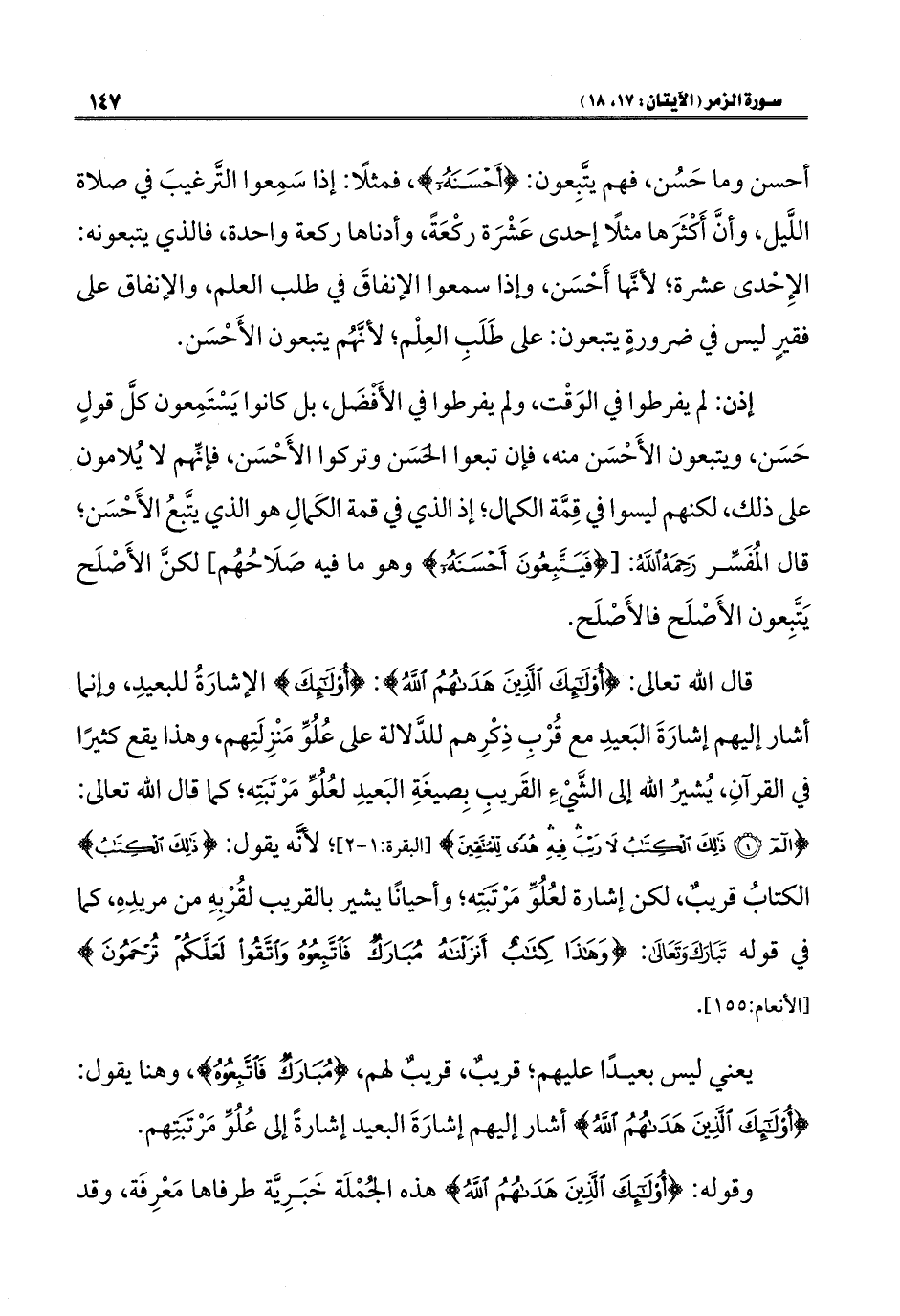 قال الله تعالى: {أُولَئِكَ الَّذِينَ هَدَاهُمُ اللَّهُ}: {أُولَئِكَ} الإشارَةُ للبعيدِ، وإنما أشار إليهم إشارَةَ البَعيدِ مع قُرْبِ ذِكْرِهم للدَّلالة على عُلُوِّ مَنْزِلَتِهم، وهذا يقع كثيرًا في القرآنِ، يُشيرُ الله إلى الشَّيْءِ القَريبِ بِصيغَةِ البَعيدِ لعُلُوِّ مَرْتَبَتِه؛ كما قال الله تعالى: {الم (١) ذَلِكَ الْكِتَابُ لَا رَيْبَ فِيهِ هُدًى لِلْمُتَّقِينَ} [البقرة: ١ - ٢]؛ لأنَّه يقول: {ذَلِكَ الْكِتَابُ} الكتابُ قريبُ، لكن إشارة لعُلُوِّ مَرْتَبَتِه؛ وأحيانًا يشير بالقريب لقُرْبِهِ من مريدِهِ، كما في قوله تَبَارَكَ وَتَعَالَى: {وَهَذَا كِتَابٌ أَنْزَلْنَاهُ مُبَارَكٌ فَاتَّبِعُوهُ وَاتَّقُوا لَعَلَّكُمْ تُرْحَمُونَ} [الأنعام: ١٥٥].