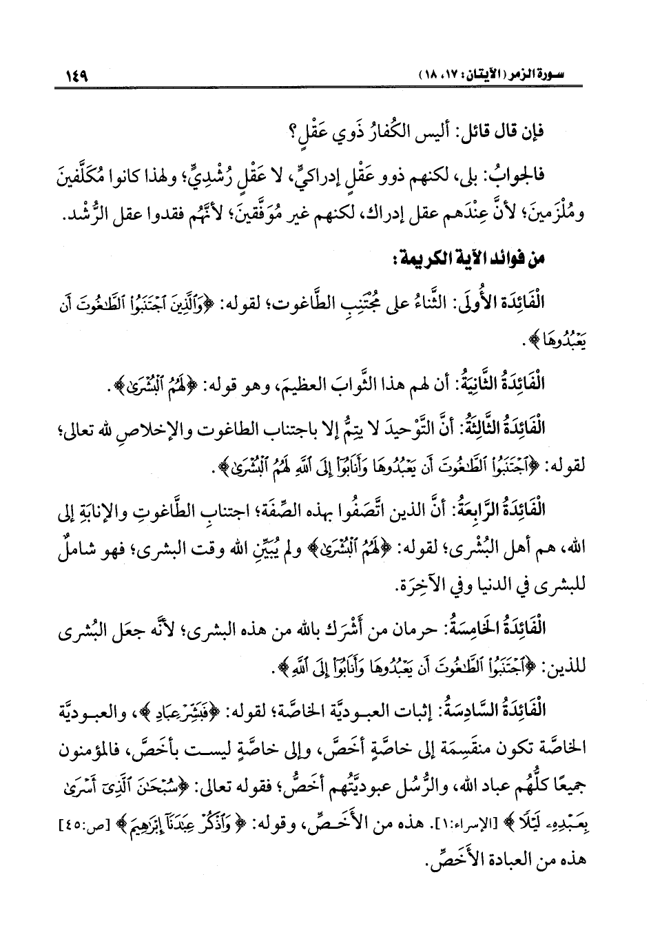 الْفَائِدَةُ السَّادِسَةُ: إثبات العبوديَّة الخاصَّة؛ لقوله: {فَبَشِّرْ عِبَادِ}، والعبوديَّة الخاصَّة تكون منقَسِمَة إلى خاصَّةٍ أخَصَّ، وإلى خاصَّةٍ ليست بأخَصَّ، فالمؤمنون جميعًا كلُّهُم عباد الله، والرُّسُل عبوديَّتُهم أخَصُّ؛ فقوله تعالى: {سُبْحَانَ الَّذِي أَسْرَى بِعَبْدِهِ لَيْلًا} [الإسراء: ١]. هذه من الأَخَصِّ، وقوله: {وَاذْكُرْ عِبَادَنَا إِبْرَاهِيمَ} [ص: ٤٥] هذه من العبادة الأَخَصِّ.