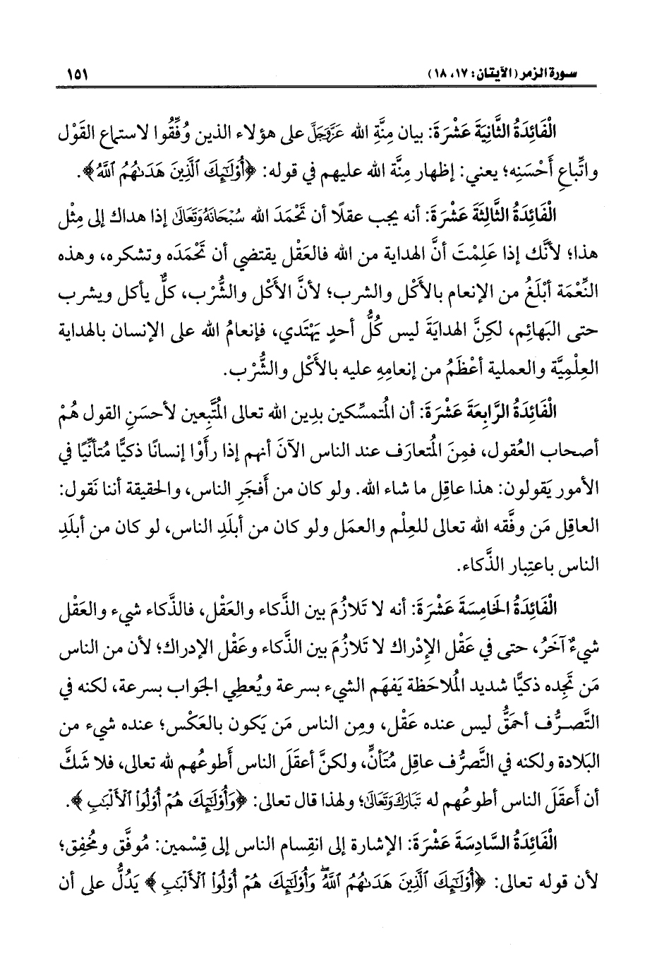 الْفَائِدَةُ الرَّابِعَةَ عَشْرَةَ: أن المُتمسِّكين بدِين الله تعالى المُتَّبِعين لأحسَنِ القول هُمْ أصحاب العُقول، فمِنَ المُتعارَف عند الناس الآنَ أنهم إذا رأَوْا إنسانًا ذكيًّا مُتأنِّيًا في الأمور يَقولون: هذا عاقِل ما شاء الله. ولو كان من أَفجَرِ الناس، والحقيقة أننا نَقول: العاقِل مَن وفَّقه الله تعالى للعِلْم والعمَل ولو كان من أبلَدِ الناس، لو كان من أبلَدِ الناس باعتِبار الذَّكاء.