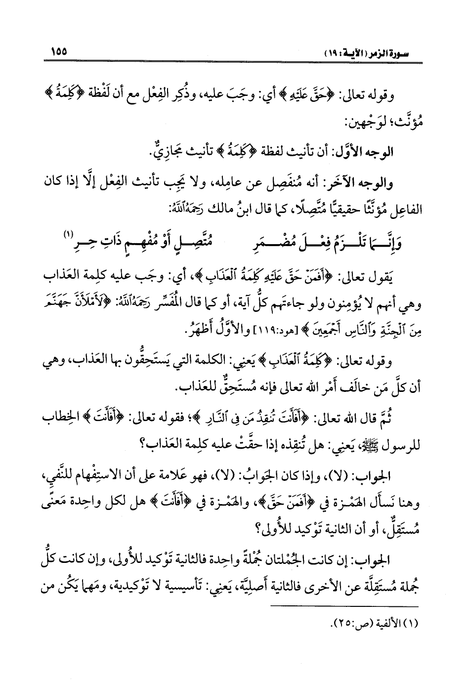 وقوله تعالى: {حَقَّ عَلَيْهِ} أي: وجَبَ عليه، وذُكِر الفِعْل مع أن لَفْظة {كَلِمَةُ} مُؤنَّث؛ لوَجْهين:
