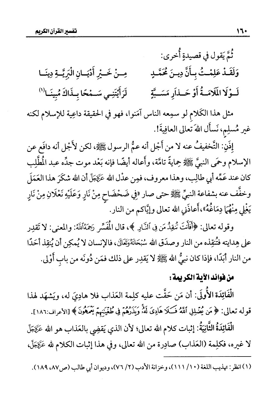 إِذَنِ: التَّخفيفُ عنه لا من أَجْل أنه عمُّ الرسول - صلى الله عليه وسلم -، لكن لأَجْل أنه دافَع عن الإسلام وحمَى النبيَّ - صلى الله عليه وسلم - حِمايةً تامَّة، وأَعاله أيضًا فإنه بَعْد موت جدِّه عبد المُطَّلِب كان عند عَمِّه أبي طالِب، وهذا معروف، فمِن عدْل الله - عَزَّ وَجَلَّ - أن الله شكَرَ هذا العَمَلَ وخفَّف عنه بشفاعة النبيِّ - صلى الله عليه وسلم - حتى صار "فِي ضَحْضَاحٍ مِنْ نَارٍ وَعَلَيْهِ نَعْلَانِ مِنْ نَارٍ يَغلي مِنْهُمَا دِمَاغُهُ"، أَعاذَني الله تعالى وإيَّاكم من النار.