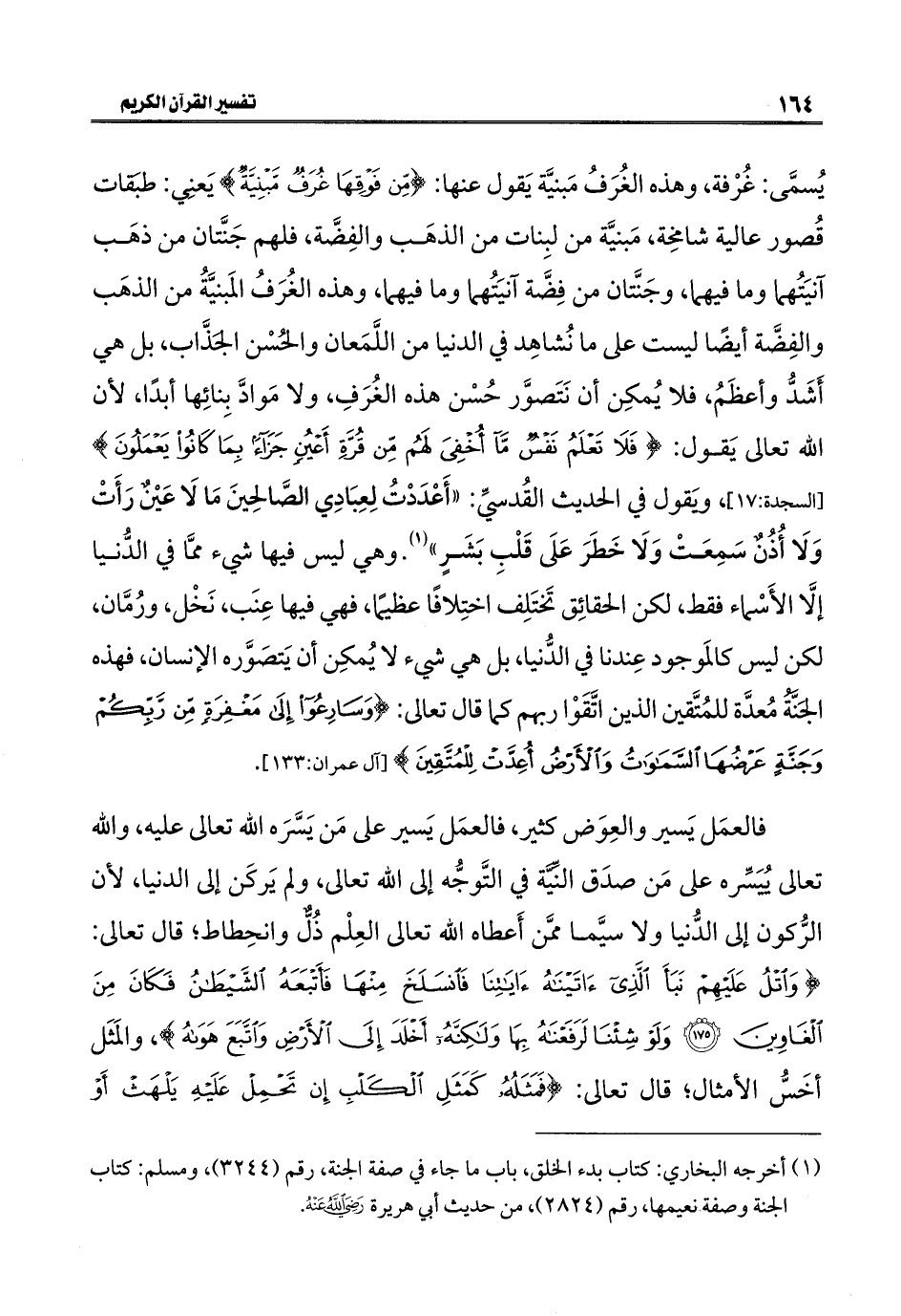 يُسمَّى: غُرْفة، وهذه الغُرَفُ مَبنيَّة يَقول عنها: {مِنْ فَوْقِهَا غُرَفٌ مَبْنِيَّةٌ} يَعنِي: طبَقات قُصور عالية شامِخة، مَبنيَّة من لبِنات من الذهَب والفِضَّة، فلهم جَنَّتان من ذهَب آنيَتُهما وما فيهما، وجَنَّتان من فِضَّة آنيَتُهما وما فيهما، وهذه الغُرَفُ المَبنيَّةُ من الذهَب والفِضَّة أيضًا ليست على ما نُشاهِد في الدنيا من اللَّمَعان والحُسْن الجَذَّاب، بل هي أَشَدُّ وأعظَمُ، فلا يُمكِن أن نَتَصوَّر حُسْن هذه الغُرَفِ، ولا مَوادَّ بِنائِها أبدًا، لأن الله تعالى يَقول: {فَلَا تَعْلَمُ نَفْسٌ مَا أُخْفِيَ لَهُمْ مِنْ قُرَّةِ أَعْيُنٍ جَزَاءً بِمَا كَانُوا يَعْمَلُونَ} [السجدة: ١٧]، ويَقول في الحديث القُدسيِّ: "أَعْدَدْتُ لِعِبَادِي الصَّالِحينَ مَا لَا عَيْنٌ رَأَتْ وَلَا أُذُنٌ سَمِعَتْ وَلَا خَطَرَ عَلَى قَلْبِ بَشَرٍ" (١). وهي ليس فيها شيء ممَّا في الدُّنيا إلَّا الأَسْماء فقط، لكن الحقائِق تَختَلِف اختِلافًا عظيمًا، فهي فيها عِنَب، نَخْل، ورُمَّان، لكن ليس كالمَوجود عِندنا في الدُّنيا، بل هي شيء لا يُمكِن أن يَتصَوَّره الإنسان، فهذه الجَنَّةُ مُعدَّة للمُتَّقين الذين اتَّقَوْا ربهم كما قال تعالى: {وَسَارِعُوا إِلَى مَغْفِرَةٍ مِنْ رَبِّكُمْ وَجَنَّةٍ عَرْضُهَا السَّمَاوَاتُ وَالْأَرْضُ أُعِدَّتْ لِلْمُتَّقِينَ} [آل عمران: ١٣٣].