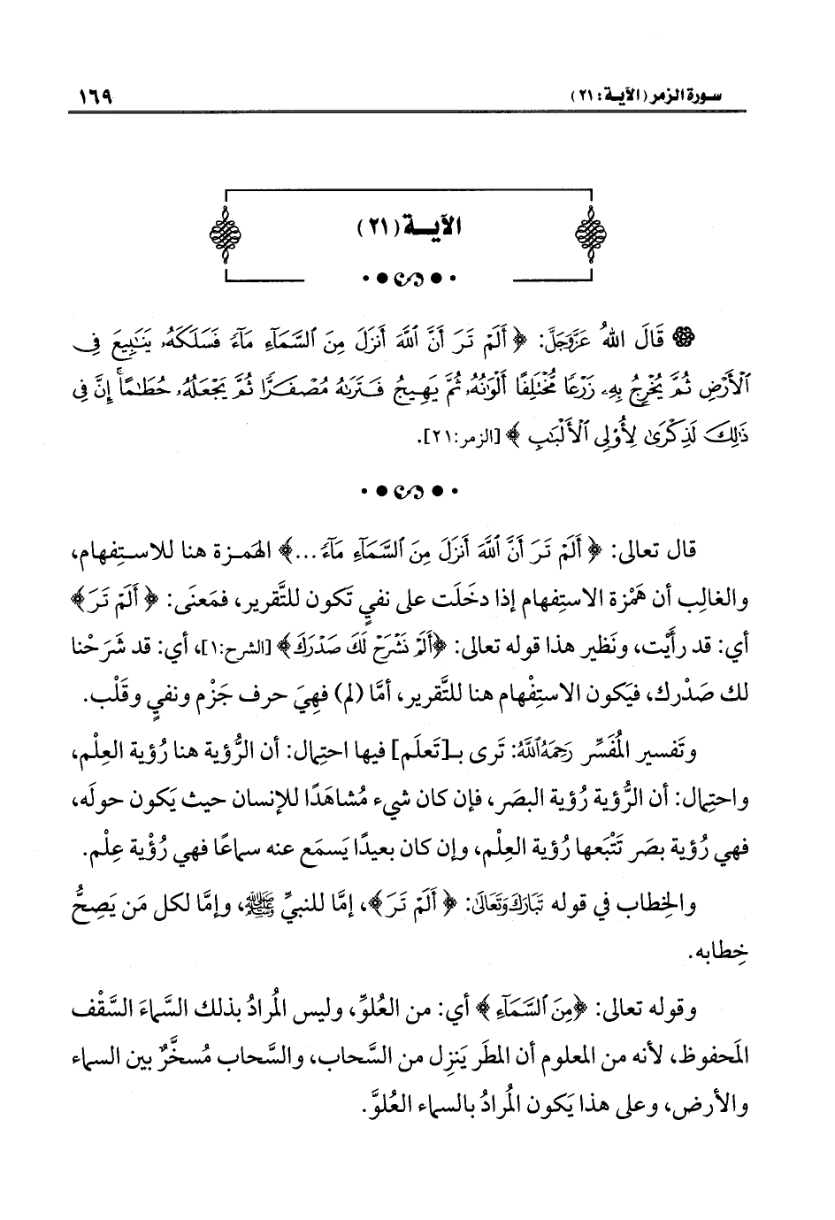 * قَالَ اللهُ عَزَّ وَجَلَّ: {أَلَمْ تَرَ أَنَّ اللَّهَ أَنْزَلَ مِنَ السَّمَاءِ مَاءً فَسَلَكَهُ يَنَابِيعَ فِي الْأَرْضِ ثُمَّ يُخْرِجُ بِهِ زَرْعًا مُخْتَلِفًا أَلْوَانُهُ ثُمَّ يَهِيجُ فَتَرَاهُ مُصْفَرًّا ثُمَّ يَجْعَلُهُ حُطَامًا إِنَّ فِي ذَلِكَ لَذِكْرَى لِأُولِي الْأَلْبَابِ} [الزمر: ٢١].