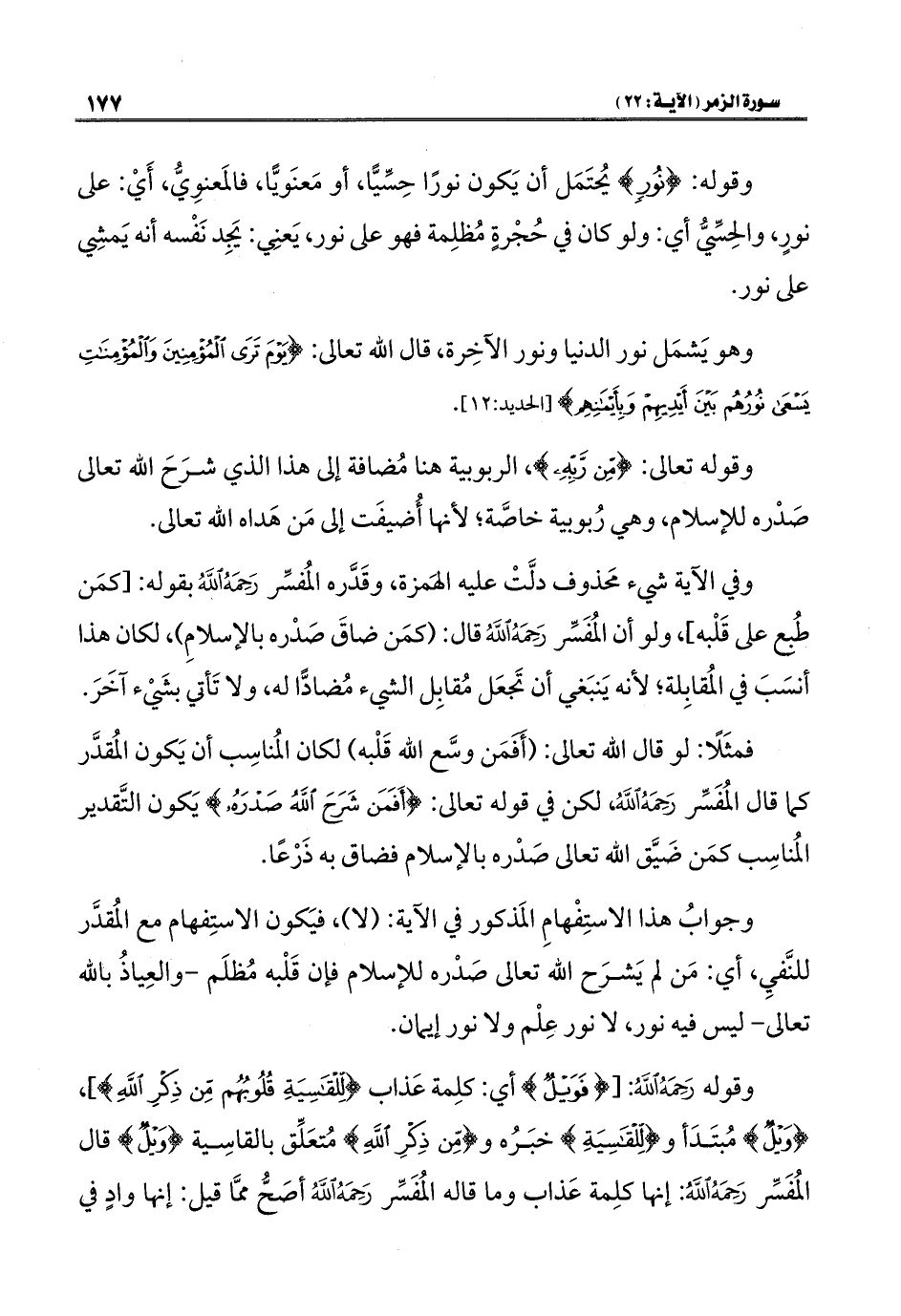 وقوله رَحِمَهُ اللهُ: [{فَوَيْلٌ} أي: كلِمة عَذاب {لِلْقَاسِيَةِ قُلُوبُهُمْ مِنْ ذِكْرِ اللَّهِ}]، {وَيْلٌ} مُبتَدَأ و {لِلْقَاسِيَةِ} خبَرُه و {مِنْ ذِكْرِ اللَّهِ} مُتعَلِّق بالقاسِية {وَيْلٌ} قال المُفَسِّر رَحِمَهُ اللهُ: إنها كلِمة عَذاب وما قاله المُفَسِّر رَحِمَهُ اللهُ أصَحُّ ممَّا قيل: إنها وادٍ في