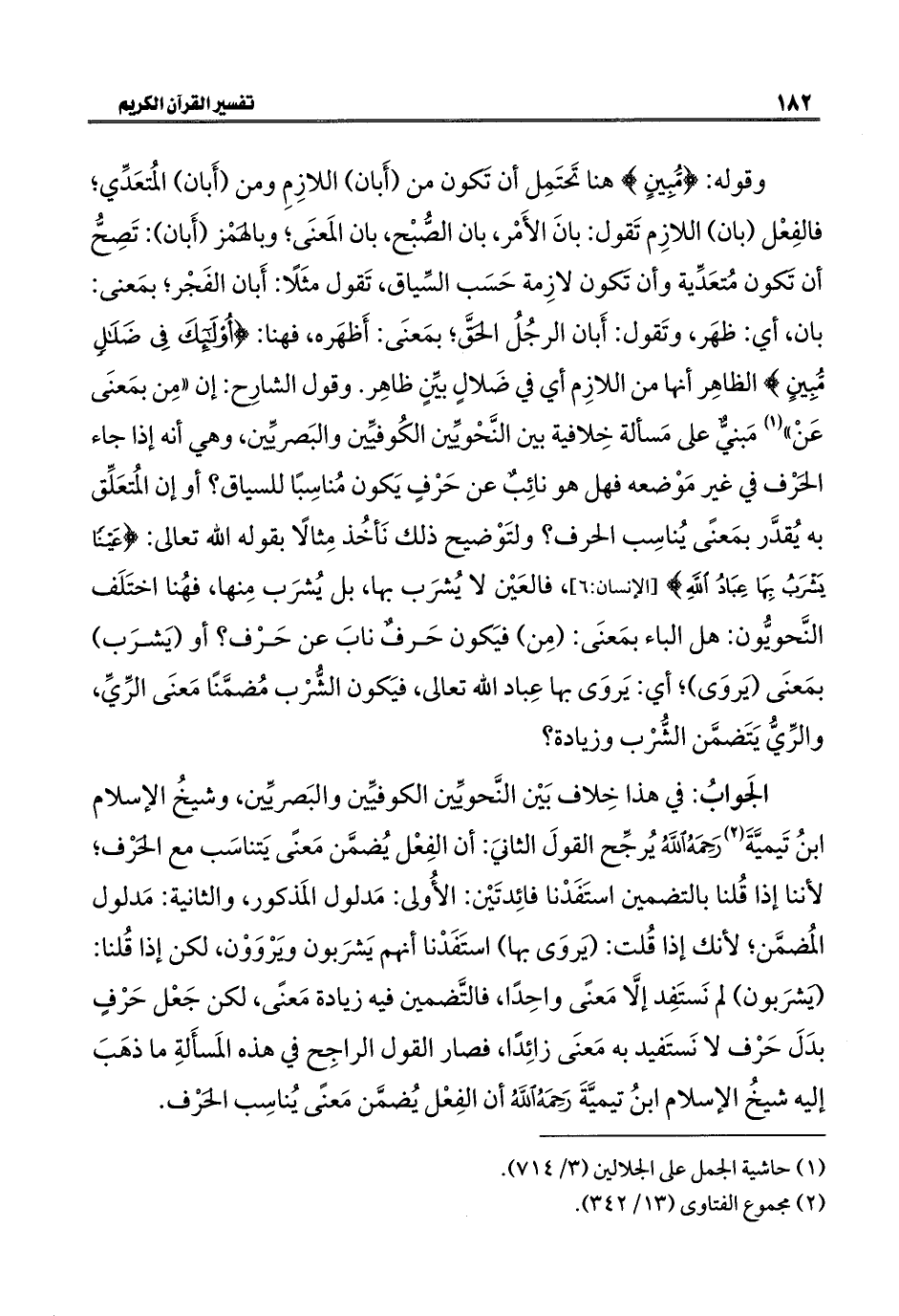 الجَوابُ: في هذا خِلاف بَيْن النَّحويِّين الكوفيِّين والبَصريِّين، وشيخُ الإسلام ابنُ تَيميَّةَ (٢) رَحِمَهُ اللهُ يُرجِّح القولَ الثانيَ: أن الفِعْل يُضمَّن مَعنًى يَتناسَب مع الحَرْف؛ لأننا إذا قُلنا بالتضمين استَفَدْنا فائِدتَيْن: الأُولى: مَدلول المَذكور، والثانية: مَدلول المُضمَّن؛ لأنك إذا قُلت: (يَروَى بها) استَفَدْنا أنهم يَشرَبون وَيرْوَوْن، لكن إذا قُلنا: (يَشرَبون) لم نَستَفِد إلَّا مَعنًى واحِدًا، فالتَّضمين فيه زيادة مَعنًى، لكن جَعْل حَرْفٍ بدَلَ حَرْف لا نَستَفيد به مَعنَى زائِدًا، فصار القول الراجِح في هذه المَسأَلةِ ما ذهَبَ إليه شيخُ الإسلام ابنُ تيميَّةَ رَحِمَهُ اللهُ أن الفِعْل يُضمَّن مَعنًى يُناسِب الحَرْف.