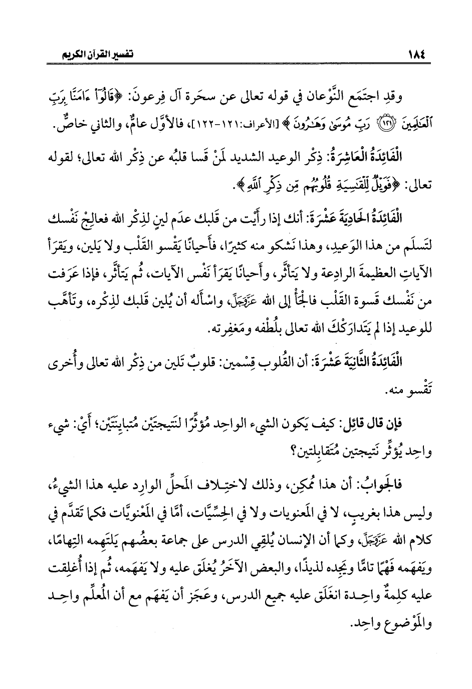 الْفَائِدَةُ الْعَاشِرَةُ: ذِكْر الوعيد الشديد لمَنْ قَسا قلبُه عن ذِكْر الله تعالى؛ لقوله تعالى: {فَوَيْلٌ لِلْقَاسِيَةِ قُلُوبُهُمْ مِنْ ذِكْرِ اللَّهِ}.
