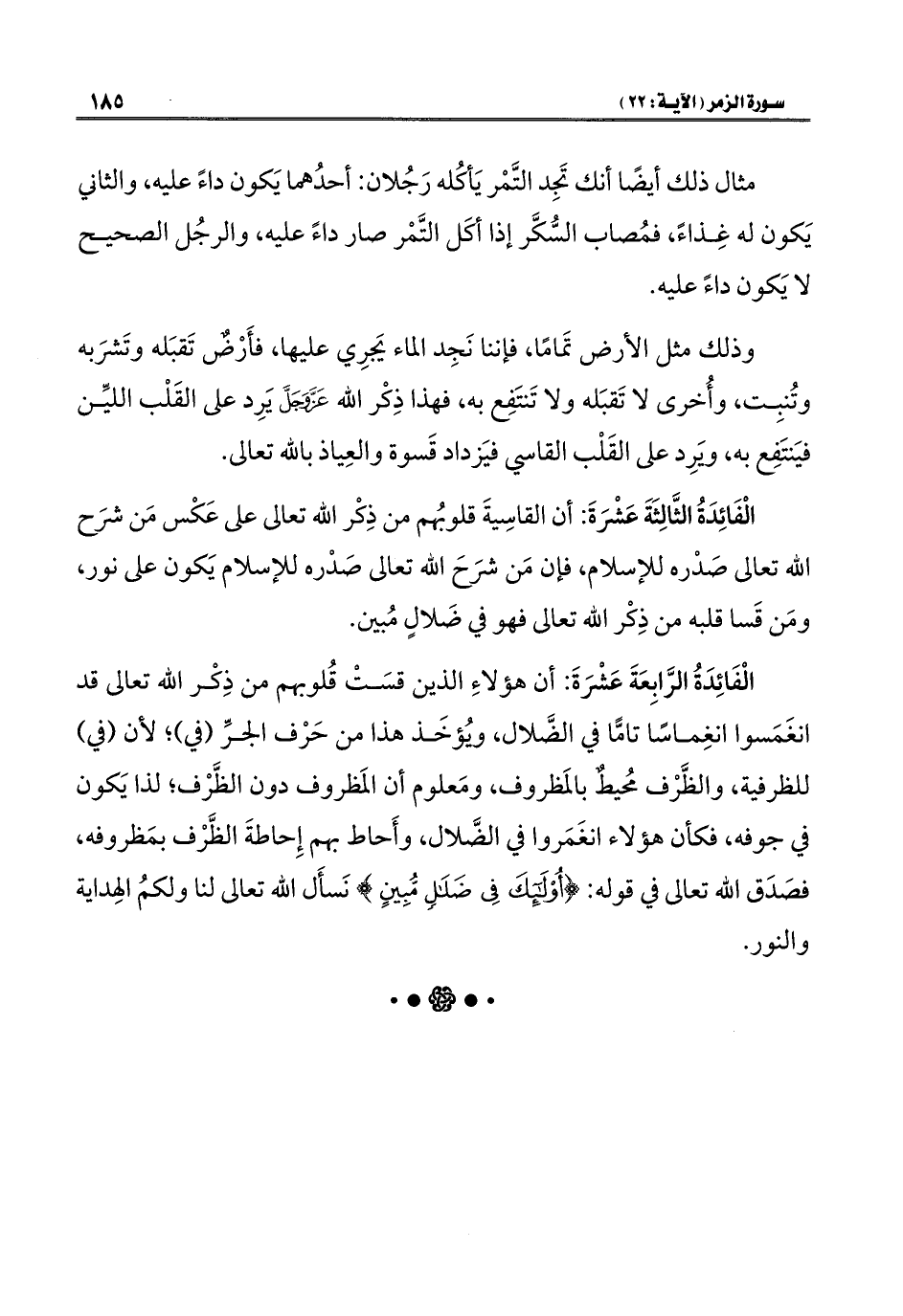 الْفَائِدَةُ الرَّابِعَةَ عَشْرَةَ: أن هؤلاءِ الذين قسَتْ قُلوبهم من ذِكْر الله تعالى قد انغَمَسوا انغِماسًا تامًّا في الضَّلال، ويُؤخَذ هذا من حَرْف الجرِّ (في)؛ لأن (في) للظرفية، والظَّرْف مُحيطٌ بالمَظروف، ومَعلوم أن المَظروف دون الظَّرْف؛ لذا يَكون في جوفه، فكأن هؤلاء انغَمَروا في الضَّلال، وأَحاط بهم إِحاطةَ الظَّرْف بمَظروفه، فصَدَق الله تعالى في قوله: {أُولَئِكَ فِي ضَلَالٍ مُبِينٍ} نَسأَل الله تعالى لنا ولكمُ الهِداية والنور.