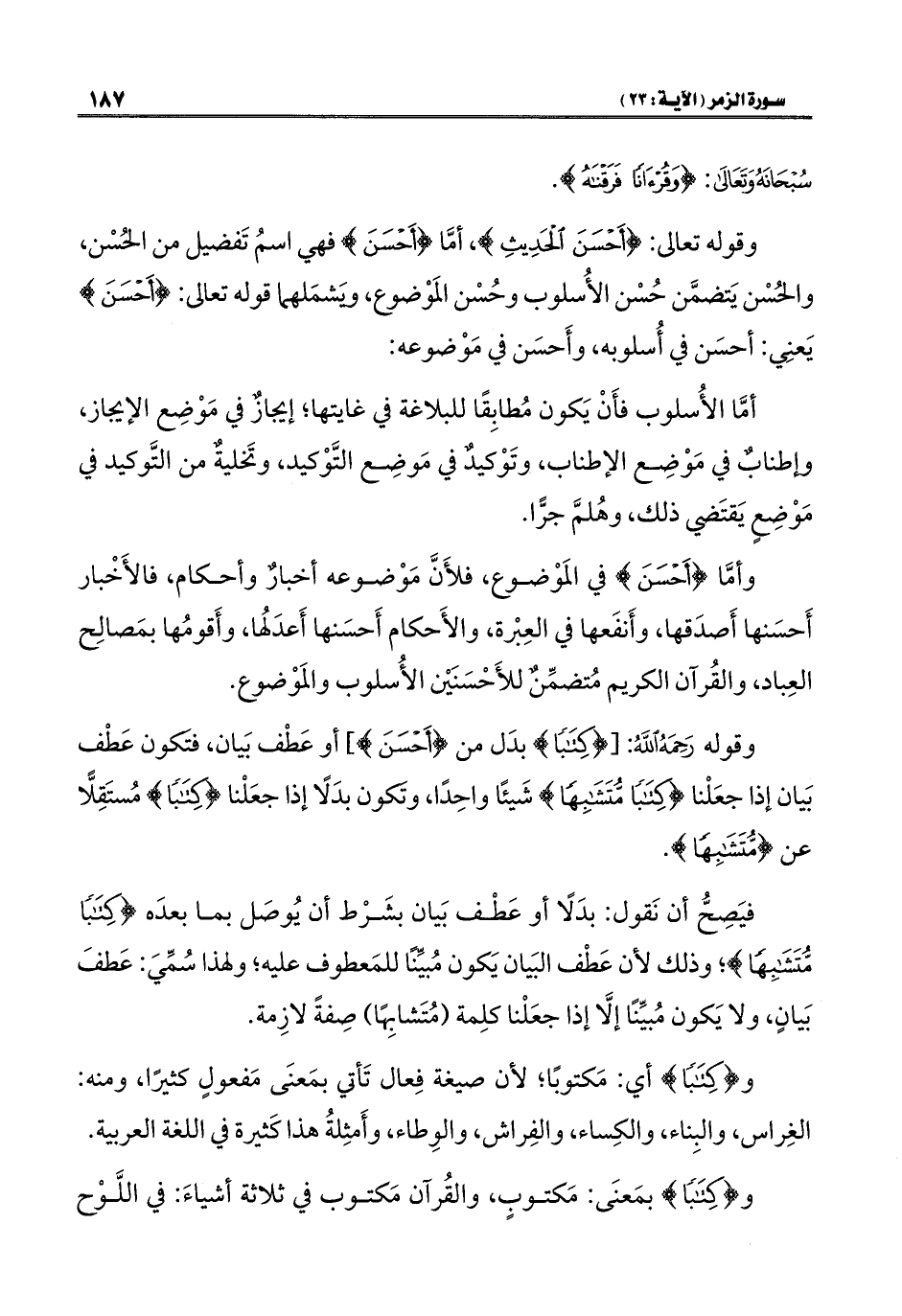 وقوله رَحِمَهُ اللهُ: [{كِتَابًا} بدَل من {أَحْسَنَ}]، أو عَطْف بَيان، فتكون عَطْف بَيان إذا جعَلْنا {كِتَابًا مُتَشَابِهًا} شَيئًا واحِدًا، وتَكون بدَلًا إذا جعَلْنا {كِتَابًا} مُستَقِلًّا عن {مُتَشَابِهًا}.
