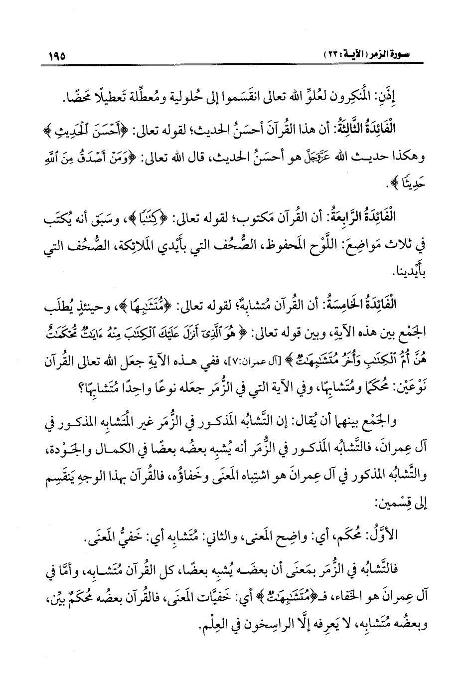 والجَمْع بينهما أن يُقال: إن التَّشابُه المَذكور في الزُّمَر غير المُتَشابِه المذكور في آل عِمرانَ، فالتَّشابُه المَذكور في الزُّمَر أنه يُشبِه بعضُه بعضًا في الكمال والجَوْدة، والتَّشابُه المذكور في آل عِمرانَ هو اشتِباه المَعنَى وخَفاؤُه، فالقُرآن بهذا الوجهِ يَنقَسِم إلى قِسْمين: