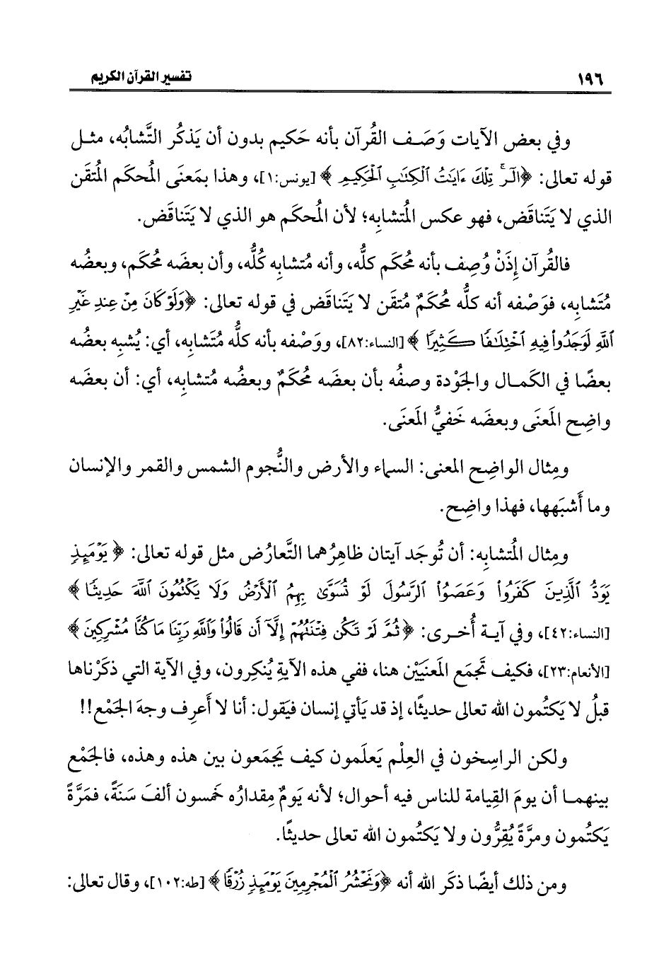 فالقُرآن إِذَنْ وُصِف بأنه مُحكَم كلُّه، وأنه مُتشابِه كُلُّه، وأن بعضَه مُحكَم، وبعضُه مُتَشابِه، فوَصْفه أنه كلُّه محُكَمٌ مُتقَن لا يَتَناقَض في قوله تعالى: {وَلَوْ كَانَ مِنْ عِنْدِ غَيْرِ اللَّهِ لَوَجَدُوا فِيهِ اخْتِلَافًا كَثِيرًا} [النساء: ٨٢]، ووَصْفه بأنه كلُّه مُتَشابِه، أي: يُشبِه بعضُه بعضًا في الكَمال والجَوْدة وصفُه بأن بعضَه مُحكَمٌ وبعضُه مُتشابِه، أي: أن بعضَه واضِح المَعنَى وبعضَه خَفيُّ المَعنَى.