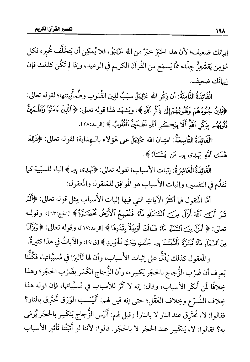 الْفَائِدَةُ الْعَاشِرَةُ: إثبات الأسباب؛ لقوله تعالى: {يَهْدِي بِهِ} الباء للسبَبية كما تَقدَّم في التفسير، وإثبات الأَسباب هو المُوافِق للمَنقول والمَعقول: