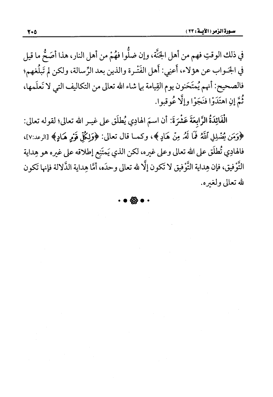 الْفَائِدَةُ الرَّابِعَةَ عَشْرَةَ: أن اسمَ الهادِي يُطلَق على غير الله تعالى؛ لقوله تعالى: {وَمَنْ يُضْلِلِ اللَّهُ فَمَا لَهُ مِنْ هَادٍ}، وكما قال تعالى: {وَلِكُلِّ قَوْمٍ هَادٍ} [الرعد: ٧]، فالهادِي تُطلَق على الله تعالى وعلى غيره، لكن الذي يَمتَنِع إطلاقه على غيره هو هِداية التَّوْفيق، فإن هِداية التَّوْفيق لا تَكون إلَّا لله تعالى وحدَه، أمَّا هِداية الدَّلالة فإنها تَكون لله تعالى ولغيره.