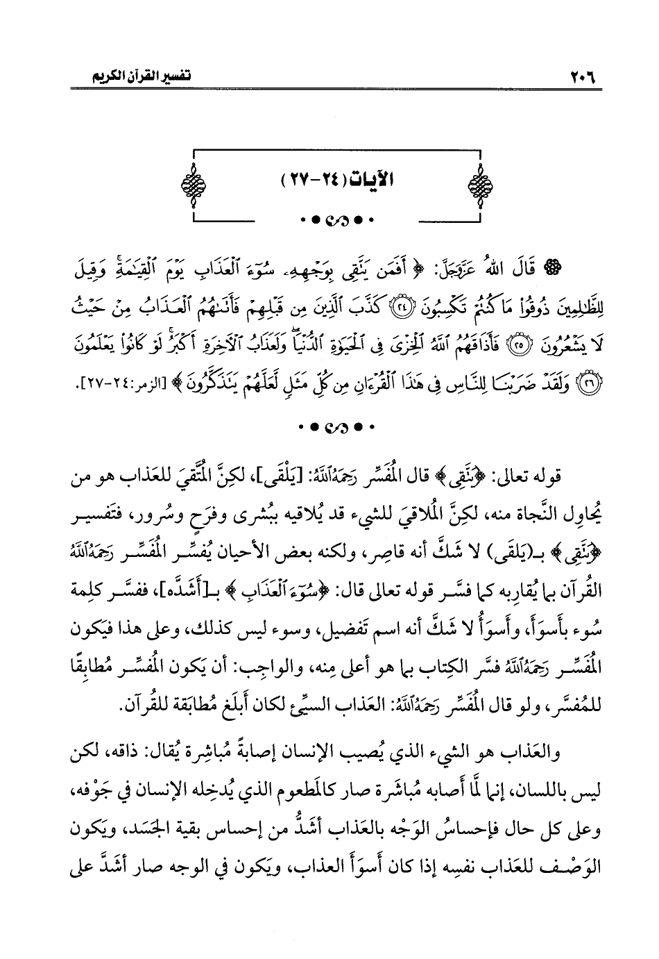 قوله تعالى: {يَتَّقِي} قال المُفَسِّر رَحِمَهُ اللهُ: [يَلْقَى]، لكِنَّ المُتَّقيَ للعَذاب هو من يُحاوِل النَّجاة منه، لكِنَّ المُلاقيَ للشيء قد يُلاقيه ببُشرى وفرَحٍ وسُرور، فتَفسير {يَتَّقِي} بـ (يَلقَى) لا شَكَّ أنه قاصِر، ولكنه بعض الأحيان يُفسِّر المُفَسِّر رَحِمَهُ اللهُ القُرآن بما يُقارِبه كما فسَّر قوله تعالى قال: {سُوءَ الْعَذَابِ} بـ[أَشَدَّه]، ففسَّر كلِمة سُوء بأَسوَأَ، وأَسوَأُ لا شَكَّ أنه اسم تَفضيل، وسوء ليس كذلك، وعلى هذا فيَكون المُفَسِّر رَحِمَهُ اللهُ فسَّر الكِتاب بما هو أعلى مِنه، والواجِب: أن يَكون المُفسِّر مُطابِقًا للمُفسَّر، ولو قال المُفَسِّر رَحِمَهُ اللهُ: العَذاب السيِّئ لكان أَبلَغ مُطابَقة للقُرآن.
