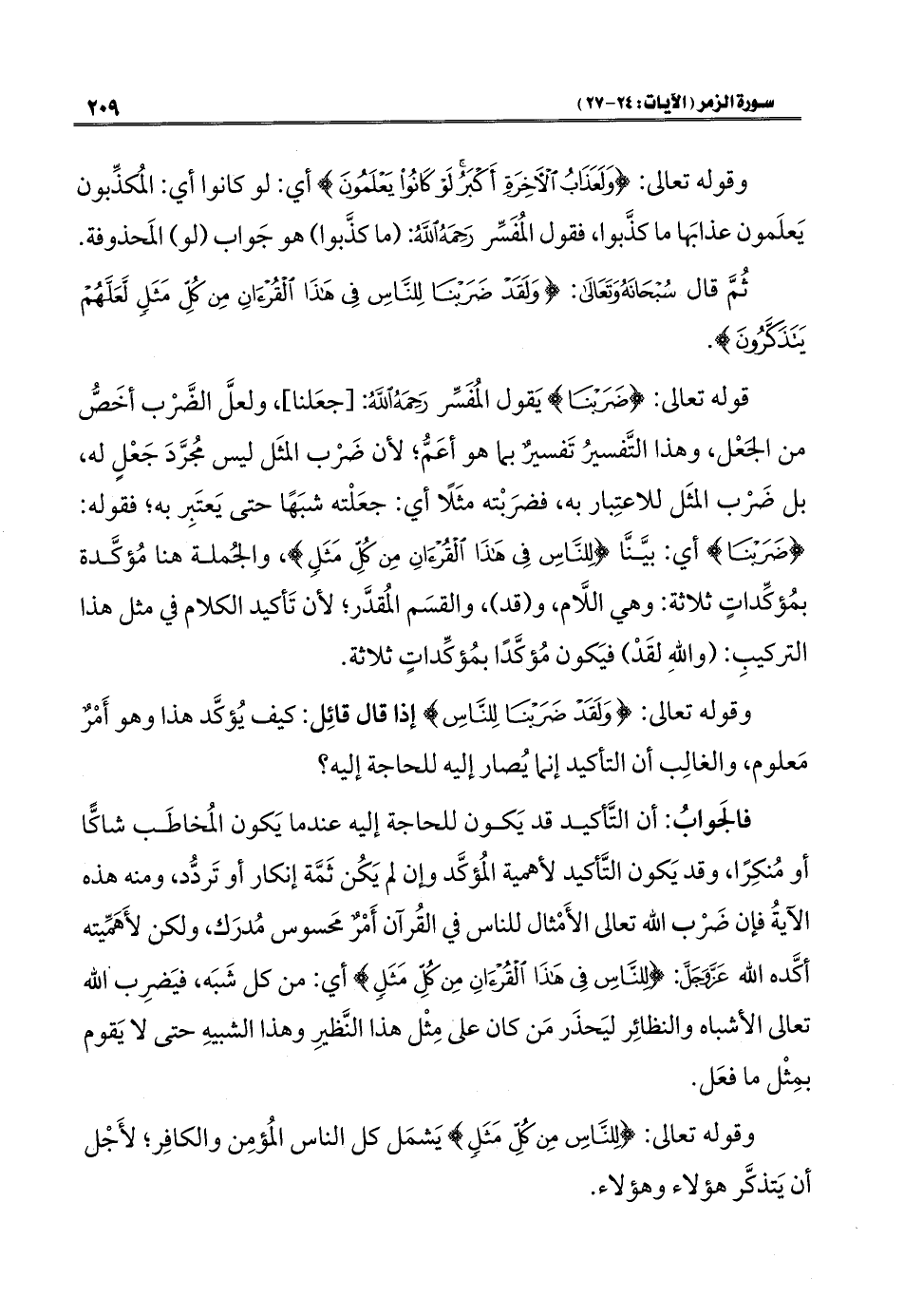 قوله تعالى: {ضَرَبْنَا} يَقول المُفَسِّر رَحِمَهُ اللهُ: [جعَلنا]، ولعلَّ الضَّرْب أخَصُّ من الجَعْل، وهذا التَّفسيرُ تَفسيرٌ بما هو أعَمُّ؛ لأن ضَرْب المثَل ليس مُجرَّدَ جَعْلٍ له، بل ضَرْب المثَل للاعتِبار به، فضرَبْته مثَلًا أي: جعَلْته شبَهًا حتى يَعتَبِر به؛ فقوله: {ضَرَبْنَا} أي: بيَّنَّا {لِلنَّاسِ فِي هَذَا الْقُرْآنِ مِنْ كُلِّ مَثَلٍ}، والجُملة هنا مُؤكَّدة بمُؤكِّداتٍ ثلاثة: وهي اللَّام، و (قد)، والقسَم المُقدَّر؛ لأن تَأكيد الكلام في مثل هذا التركيبِ: (واللهِ لقَدْ) فيَكون مُؤكَّدًا بمُؤكِّداتٍ ثلاثة.