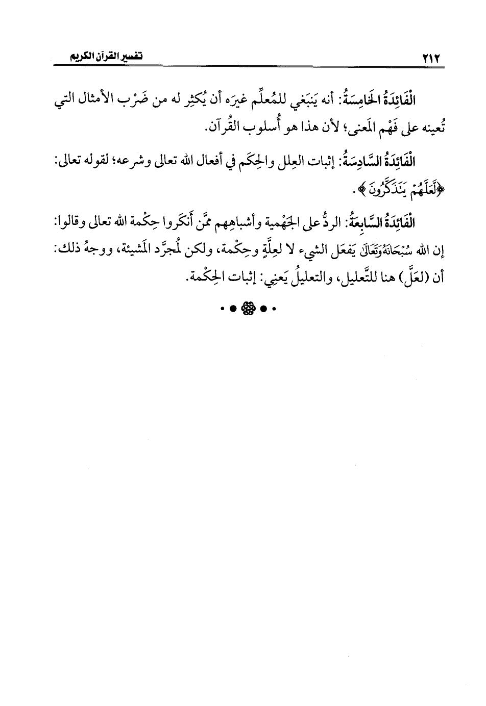 الْفَائِدَةُ السَّابِعَةُ: الردُّ على الجَهْمية وأشباهِهم ممَّن أَنكَروا حِكْمة الله تعالى وقالوا: إن الله سُبْحَانَهُ وَتَعَالَى يَفعَل الشيء لا لعِلَّةٍ وحِكْمة، ولكن لمُجرَّد المَشيئة، ووجهُ ذلك: أن (لعَلَّ) هنا للتَّعليل، والتعليلُ يَعنِي: إثبات الحِكْمة.