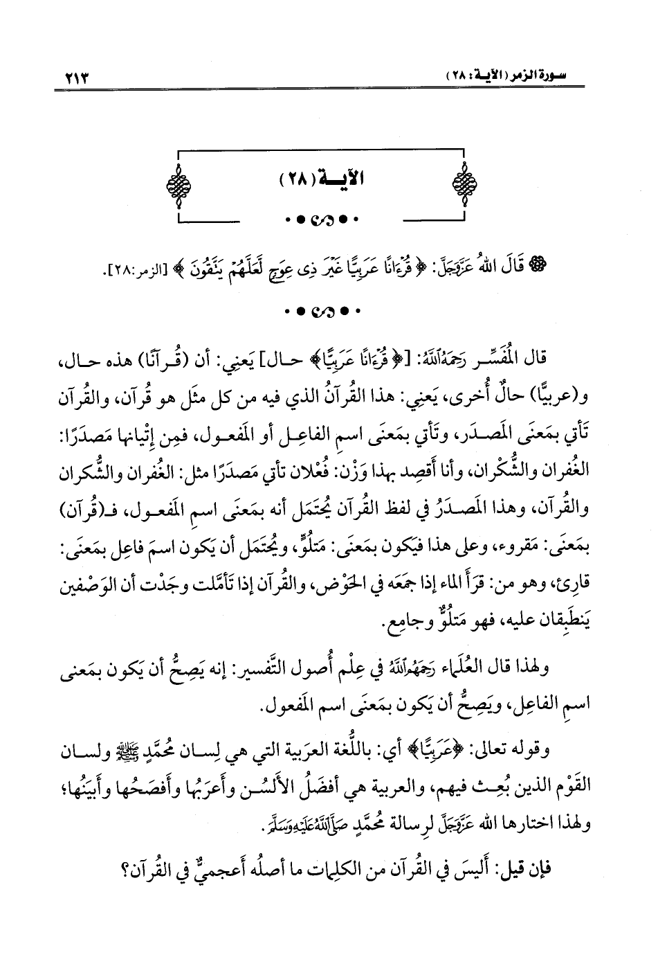 قال المُفَسِّر رَحِمَهُ اللهُ: [{قُرْآنًا عَرَبِيًّا} حال] يَعنِي: أن (قُرآنًا) هذه حال، و (عربيًّا) حالٌ أُخرى، يَعنِي: هذا القُرآنُ الذي فيه من كل مثَل هو قُرآن، والقُرآن تَأتي بمَعنَى المَصدَر، وتَأتي بمَعنَى اسمِ الفاعِل أو المَفعول، فمِن إِتْيانها مَصدَرًا: الغُفران والشُّكْران، وأنا أَقصِد بهذا وَزْن: فُعْلان تأتي مَصدَرًا مثل: الغُفران والشُّكران والقُرآن، وهذا المَصدَرُ في لفظ القُرآن يُحتَمَل أنه بمَعنَى اسمِ المَفعول، فـ (قُرآن) بمَعنَى: مَقروء، وعلى هذا فيَكون بمَعنَى: مَتلُوٍّ، ويُحتَمَل أن يَكون اسمَ فاعِل بمَعنَى: قارِئ، وهو من: قرَأَ الماء إذا جمَعَه في الحَوْض، والقُرآن إذا تَأمَّلت وجَدْت أن الوَصْفين يَنطَبِقان عليه، فهو مَتلُوٌّ وجامِع.
