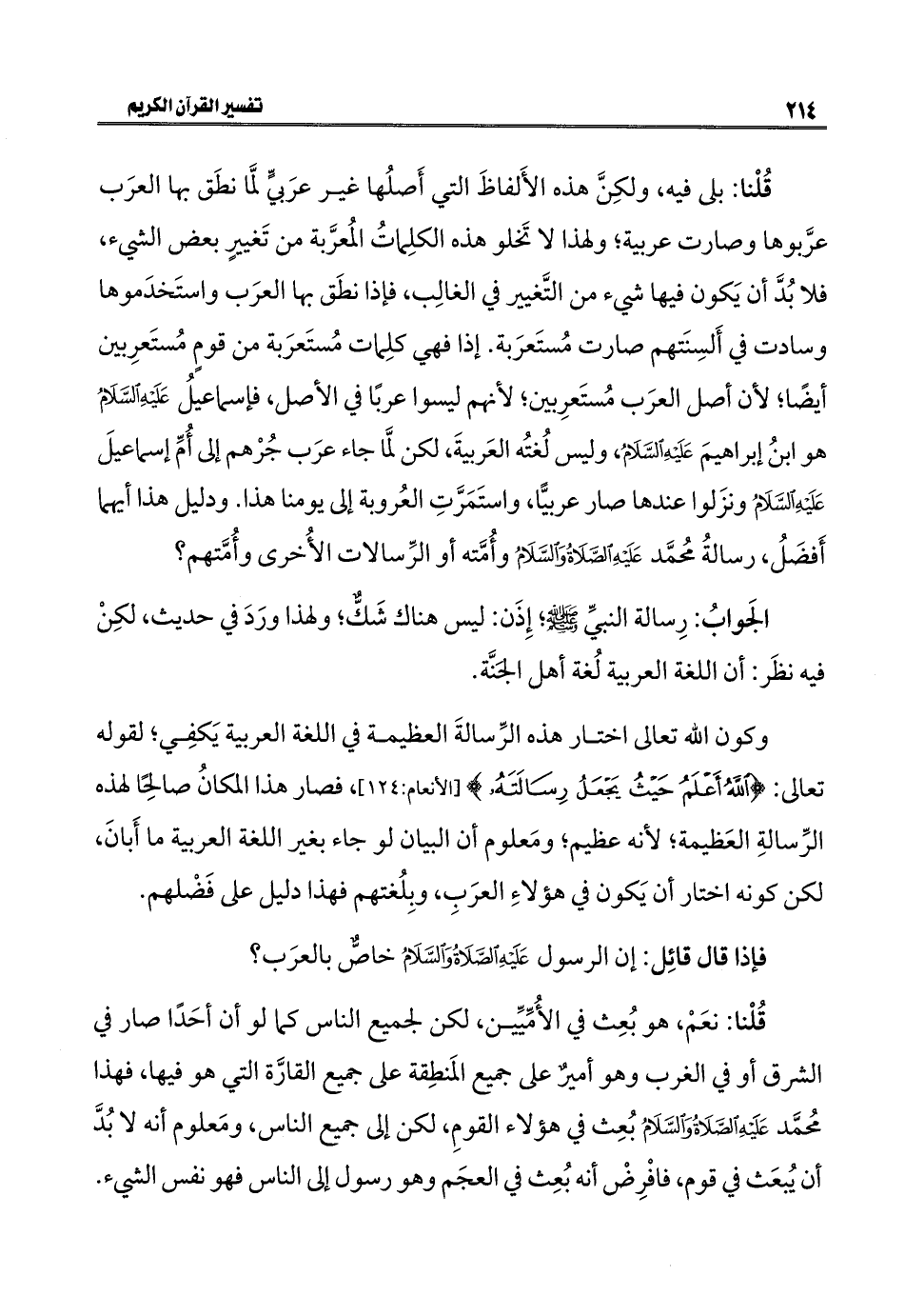 قُلْنا: بلى فيه، ولكِنَّ هذه الأَلفاظَ التي أَصلُها غير عرَبيٍّ لمَّا نطَق بها العرَب عرَّبوها وصارت عربية؛ ولهذا لا تَخلو هذه الكلِماتُ المُعرَّبة من تَغييرٍ بعض الشيء، فلا بُدَّ أن يَكون فيها شيء من التَّغيير في الغالِب، فإذا نطَق بها العرَب واستَخدَموها وسادت في أَلسِنَتهم صارت مُستَعرَبة. إذا فهي كلِمات مُستَعرَبة من قومٍ مُستَعرِبين أيضًا؛ لأن أصل العرَب مُستَعرِبين؛ لأنهم ليسوا عربًا في الأصل، فإسماعيلُ عَلَيْهِ السَّلَامُ هو ابنُ إبراهيمَ عَلَيْهِ السَّلَامُ، وليس لُغتُه العَربيةَ، لكن لمَّا جاء عرَب جُرْهم إلى أُمِّ إسماعيلَ عَلَيْهِ السَّلَامُ ونزَلوا عندها صار عربيًّا، واستَمَرَّتِ العُروبة إلى يومنا هذا. ودليل هذا أيهما أَفضَلُ، رسالةُ محُمَّد عَلَيْهِ الصَّلَاةُ وَالسَّلَامُ وأُمَّته أو الرِّسالات الأُخرى وأُمَّتهم؟