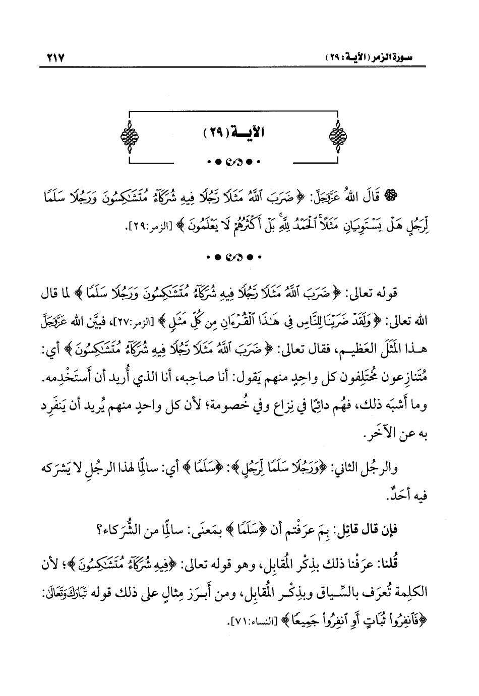 * قَالَ اللهُ عَزَّ وَجَلَّ: {ضَرَبَ اللَّهُ مَثَلًا رَجُلًا فِيهِ شُرَكَاءُ مُتَشَاكِسُونَ وَرَجُلًا سَلَمًا لِرَجُلٍ هَلْ يَسْتَوِيَانِ مَثَلًا الْحَمْدُ لِلَّهِ بَلْ أَكْثَرُهُمْ لَا يَعْلَمُونَ} [الزمر: ٢٩].