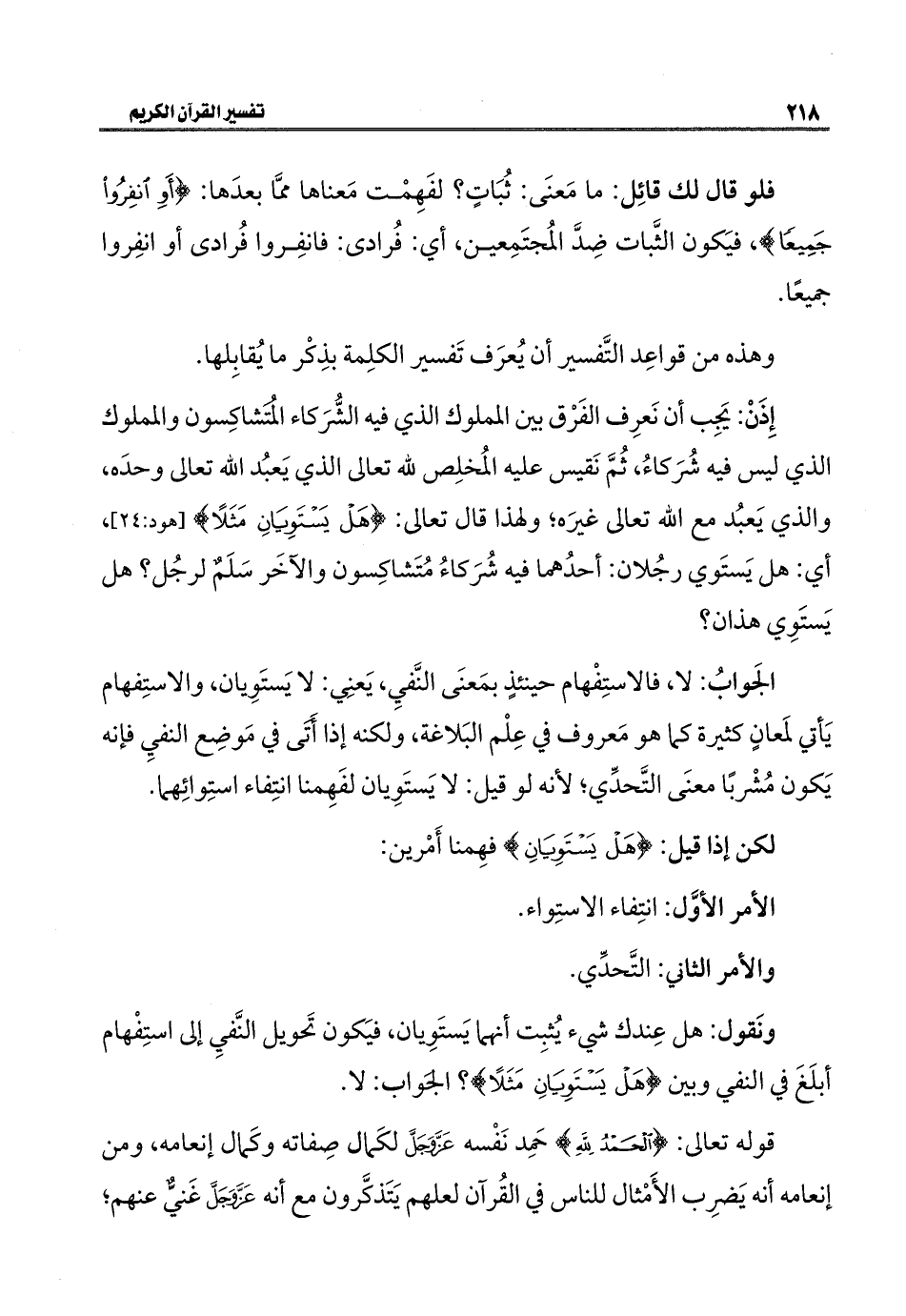 الجَوابُ: لا، فالاستِفْهام حينئذٍ بمَعنَى النَّفيِ، يَعنِي: لا يَستَوِيان، والاستِفهام يَأتي لمَعانٍ كثيرة كما هو مَعروف في عِلْم البَلاغة، ولكنه إذا أَتَى في مَوضِع النفيِ فإنه يَكون مُشْربًا معنَى التَّحدِّي؛ لأنه لو قيل: لا يَستَوِيان لفَهِمنا انتِفاء استِوائِهما.