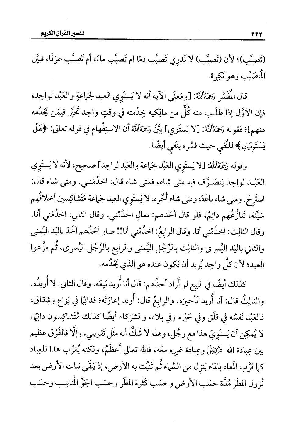 كذلك أيضًا في البيع لو أَراد أحدُهم: قال أنا أُريد بَيعَه. وقال الثاني: لا أُريدُه. والثالِثُ قال: أنا أُريد تَأجيرَه. والرابِعُ قال: أُريد إعارَتَه؛ فدائِمًا في نِزاع وشِقاق، فالعَبْد نَفسُه في قلَق وفي حَيْرة وفي بلاء، والشرَكاء أيضًا كذلك مُتَشاكِسون دائِمًا، لا يُمكِن أن يَستَوِيَ هذا مع رجُل، وهذا لا شَكَّ أنه مثَل تَقريبي، وإلَّا فالفَرْق عظيم بين عِبادة الله عَزَّ وَجَلَّ وعِبادة غيرِه معَه، فالله تعالى أَعظَمُ، ولكنه يُقرِّب هذا للعِباد كما قرَّب المَعاد بالماء يَنزِل من السَّماء ثُم تَنبُت به الأرض، إذ يَبقَى نبات الأرض بعد نُزول المطَر مُدَّة حسَب الأرض وحسَب كَثْرة المطَر وحسَب الجَوِّ المُناسِب وحسَب