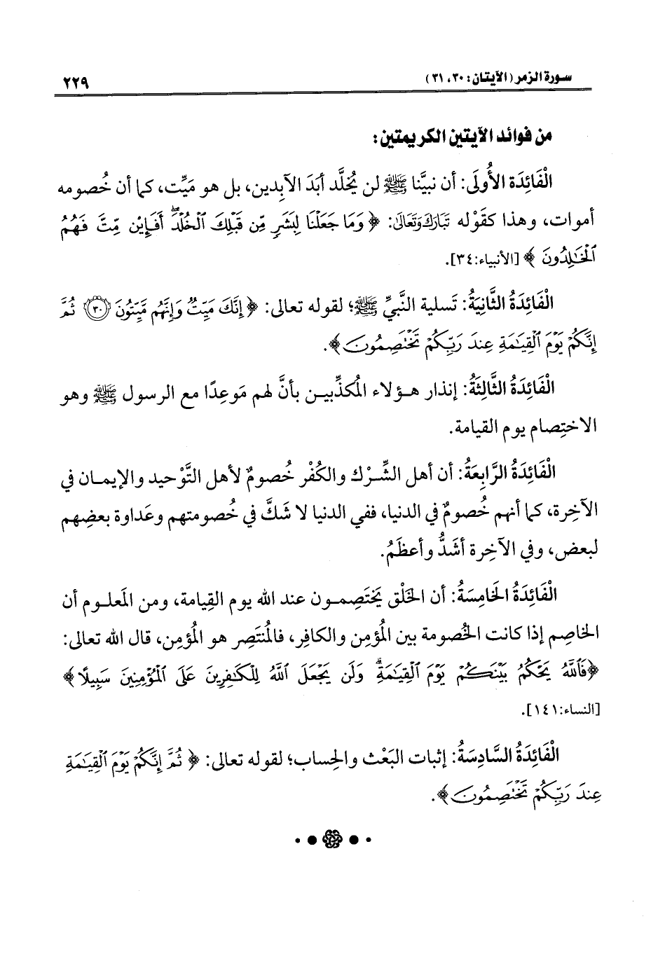 الْفَائِدَةُ الثَّانِيَةُ: تَسلية النَّبيِّ - صلى الله عليه وسلم -؛ لقوله تعالى: {إِنَّكَ مَيِّتٌ وَإِنَّهُمْ مَيِّتُونَ (٣٠) ثُمَّ إِنَّكُمْ يَوْمَ الْقِيَامَةِ عِنْدَ رَبِّكُمْ تَخْتَصِمُونَ}.