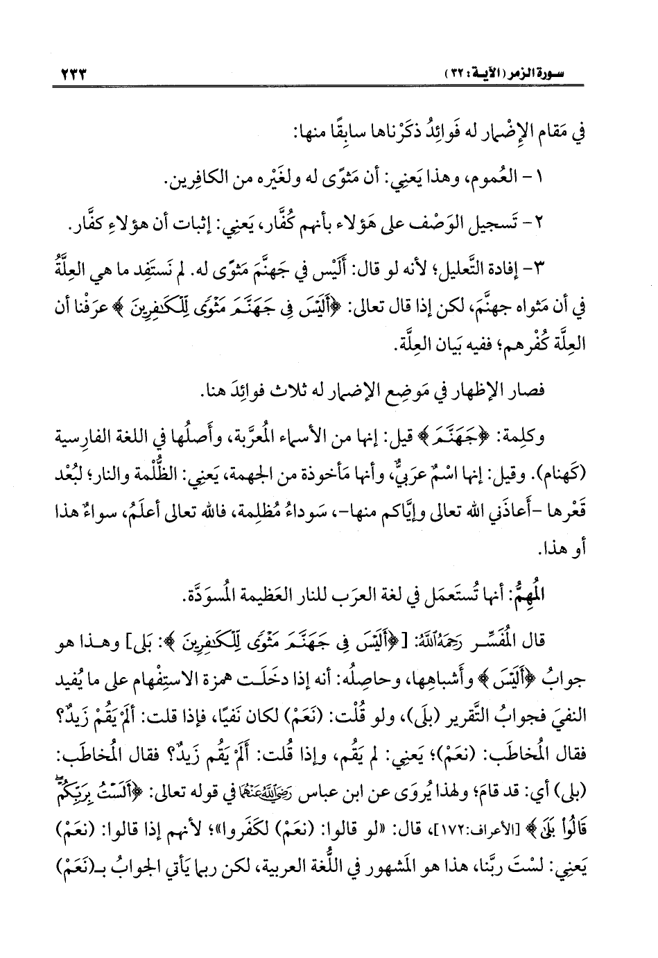 قال المُفَسِّر رَحِمَهُ اللهُ: [{أَلَيْسَ فِي جَهَنَّمَ مَثْوًى لِلْكَافِرِينَ}: بَلى] وهذا هو جوابُ {أَلَيْسَ} وأَشباهِها، وحاصِلُه: أنه إذا دخَلَت همزة الاستِفْهام على ما يُفيد النفيَ فجوابُ التَّقرير (بلَى)، ولو قُلْت: (نَعَمْ) لكان نَفيًا، فإذا قلت: ألَمْ يَقُمْ زَيدٌ؟ فقال المُخاطَب: (نعَمْ)؛ يَعنِي: لم يَقُم، وإذا قُلت: أَلَمْ يَقُم زَيدٌ؟ فقال المُخاطَب: (بلى) أي: قد قامَ؛ ولهذا يُروَى عن ابن عباس - رضي الله عنهما - في قوله تعالى: {أَلَسْتُ بِرَبِّكُمْ قَالُوا بَلَى} [الأعراف: ١٧٢]، قال: "لو قالوا: (نعَمْ) لكَفَروا"؛ لأنهم إذا قالوا: (نعَمْ) يَعنِي: لسْتَ ربَّنا، هذا هو المَشهور في اللُّغة العربية، لكن ربما يَأتي الجوابُ بـ (نَعَمْ)