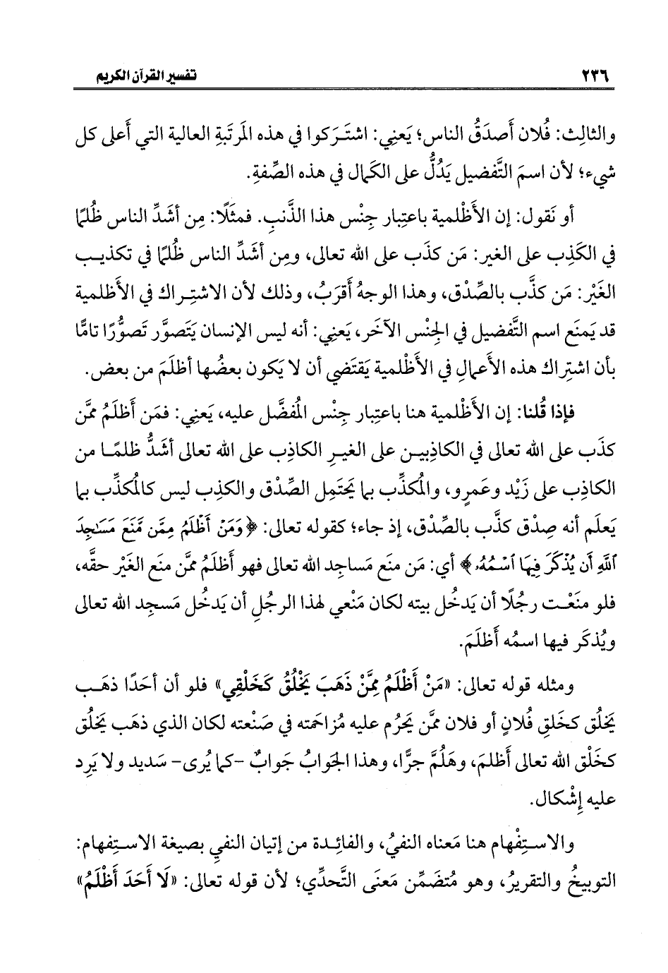 أو نَقول: إن الأَظْلمية باعتِبار جِنْس هذا الذَّنبِ. فمثَلًا: مِن أشَدِّ الناس ظُلمًا في الكَذِب على الغير: مَن كذَب على الله تعالى، ومن أشَدِّ الناس ظُلمًا في تكذيب الغَيْر: مَن كذَّب بالصِّدْق، وهذا الوجهُ أَقرَبُ، وذلك لأن الاشتِراك في الأَظلمية قد يَمنَع اسم التَّفضيل في الجِنْس الآخَر، يَعنِي: أنه ليس الإنسان يَتَصوَّر تَصوُّرًا تامًّا بأن اشتِراك هذه الأَعمالِ في الأَظْلمية يَقتَضي أن لا يَكون بعضُها أظلَمَ من بعض.