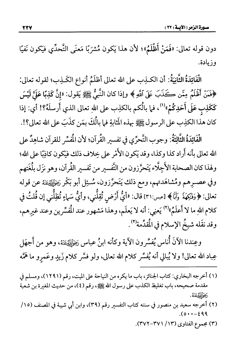 الْفَائِدَةُ الثَّالِثَةُ: وجوب التَّحرِّي في تفسير القُرآن؛ لأن المُفسِّر للقرآن شاهِدٌ على الله تعالى بأنه أَراد كذا وكذا، وقد يَكون الأَمْر على خِلاف ذلك فيَكون كاذِبًا على الله؛ ولهذا كان الصحابة الأَجِلَّاء يَتَحرَّزون من التَّفسير من تَفسير القُرآن، وهو نزَل بلُغَتهم وفي عصرِهم ومُشاهَدتهم، ومع ذلك يَتَحرَّزون، سُئِل أبو بَكْر - رضي الله عنه - عن قوله تعالى: {وَفَاكِهَةً وَأَبًّا} [عبس: ٣١] قال: "أيُّ أَرْضٍ تُقِلُّني، وأيُّ سَماءٍ تُظِلُّني إن قُلتُ في كلام اللهِ ما لا أَعلَمُ" (٢) يَعنِي: أنه لا يَعلَم، وهذا مَشهور عند المُفسِّرين وعند غيرِهم، وقد نقَله شيخُ الإسلام في المُقدِّمة (٣).