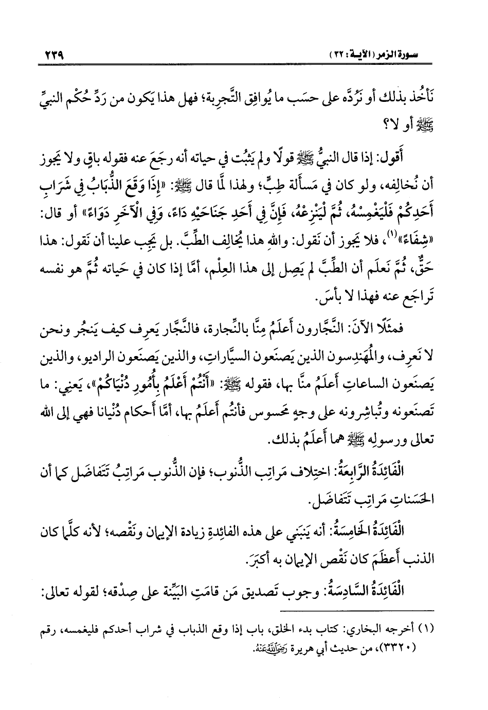 (١) أخرجه البخاري: كتاب بدء الخلق، باب إذا وقع الذباب في شراب أحدكم فليغمسه، رقم (٣٣٢٠)، من حديث أبي هريرة - رضي الله عنه -.