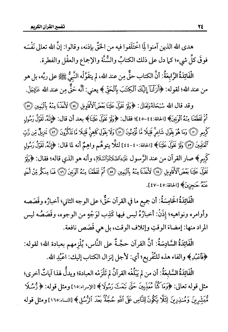 الْفَائِدَةُ الخَامِسَةُ: أن جميع ما في القرآن حَقٌّ؛ على الوجه الثاني؛ أخبارُه وقَصَصه وأوامره ونواهيه؛ إِذَنْ: أخبارُهُ ليس فيها كَذِب لوَجْهٍ من الوجوه، وقَصَصُه ليس المراد منها: إمضاءَ الوقتِ وإتلاف الوقت، بل هي قَصَص نافعة.