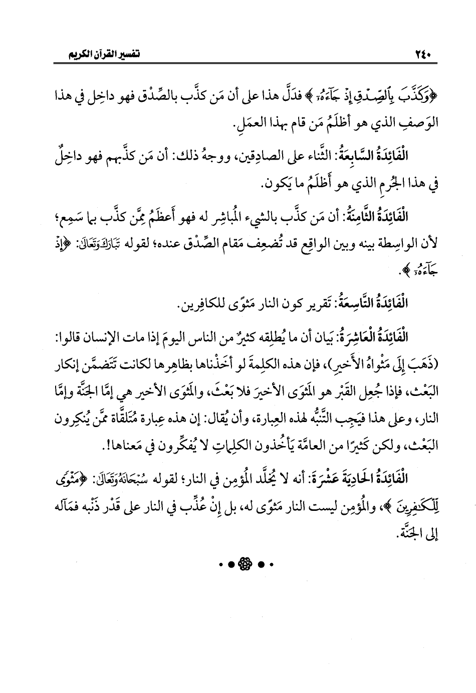 الْفَائِدَةُ الْعَاشِرَةُ: بَيان أن ما يُطلِقه كثيرٌ من الناس اليومَ إذا مات الإنسان قالوا: (ذَهَبَ إِلَى مَثْواهُ الأَخيرِ)، فإن هذه الكلِمةَ لو أخَذْناها بظاهِرها لكانت تَتَضمَّن إنكار البَعْث، فإذا جُعِل القَبْر هو المَثوَى الأخيرَ فلا بَعْثَ، والمَثوَى الأخير هي إمَّا الجَنَّة وإمَّا النار، وعلى هذا فيَجِب التَّنبُّه لهذه العِبارة، وأن يُقال: إن هذه عِبارة مُتَلقَّاة ممَّن يُنكِرون البَعْث، ولكن كَثيرًا من العامَّة يَأخُذون الكلِماتِ لا يُفكِّرون في مَعناها!.