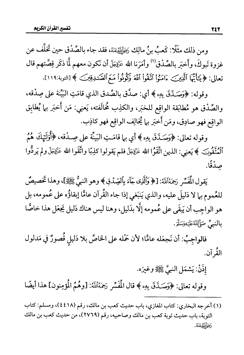 ومن ذلك مثَلًا: كَعبُ بنُ مالِك - رضي الله عنه -، فقد جاء بالصِّدْق حين تَخلَّف عن غزوة تَبوكَ، وأَخبَر بالصِّدْق (١) وأمَرَنا الله عَزَّ وَجَلَّ أن نَكون معهم لمَّا ذكَر قِصَّتهم قال تعالى: {يَاأَيُّهَا الَّذِينَ آمَنُوا اتَّقُوا اللَّهَ وَكُونُوا مَعَ الصَّادِقِينَ} [التوبة: ١١٩].