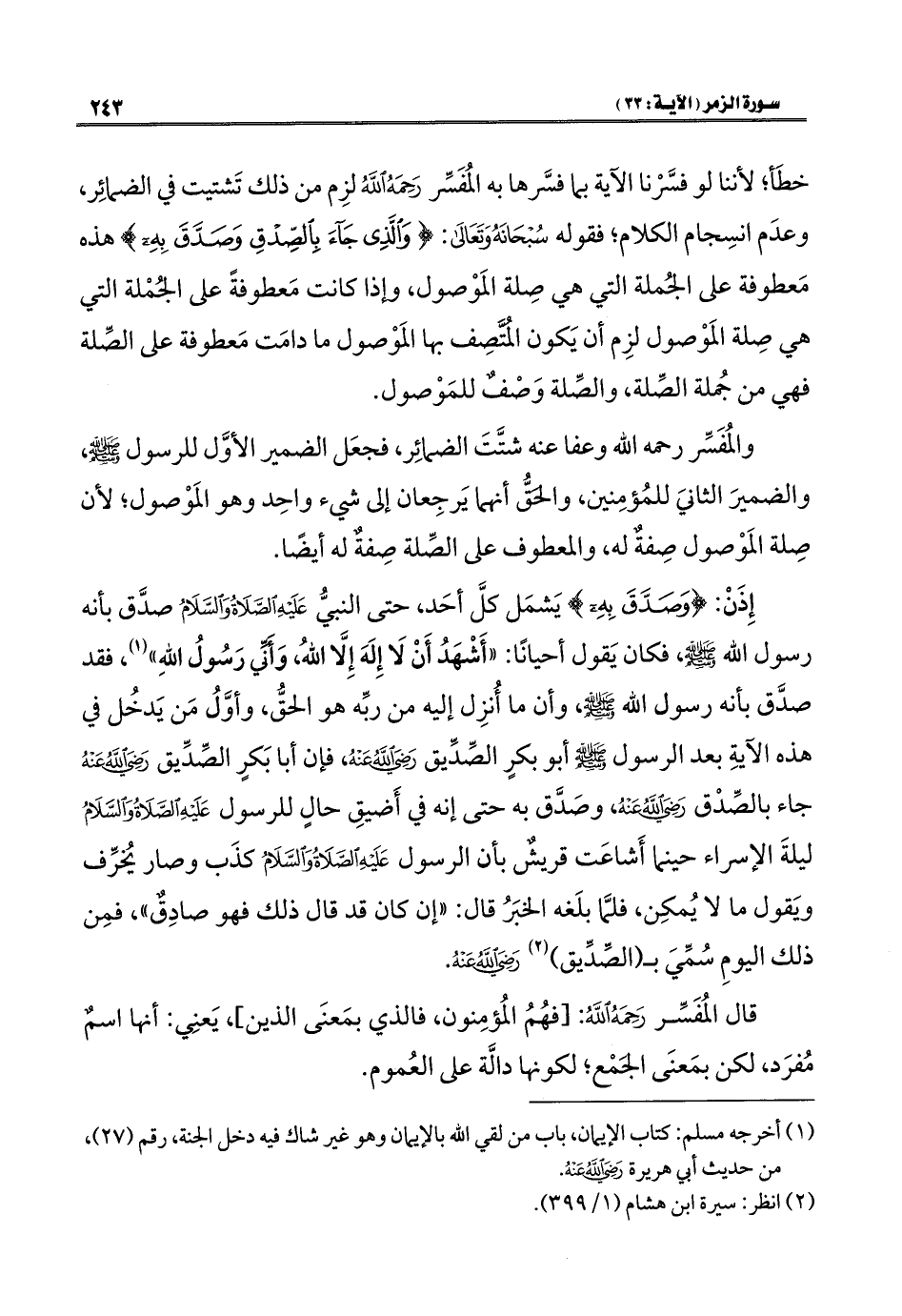 خطَأ؛ لأننا لو فسَّرْنا الآية بما فسَّرها به المُفَسِّر رَحِمَهُ اللهُ لزِم من ذلك تَشتيت في الضمائِر، وعدَم انسِجام الكلام؛ فقوله سُبْحَانَهُ وَتَعَالَى: {وَالَّذِي جَاءَ بِالصِّدْقِ وَصَدَّقَ بِهِ} هذه مَعطوفة على الجُملة التي هي صِلة المَوْصول، وإذا كانت مَعطوفةً على الجُمْلة التي هي صِلة المَوْصول لزِم أن يَكون المُتَّصِف بها المَوْصول ما دامَت مَعطوفة على الصِّلة فهي من جُملة الصِّلة، والصِّلة وَصْفٌ للمَوْصول.