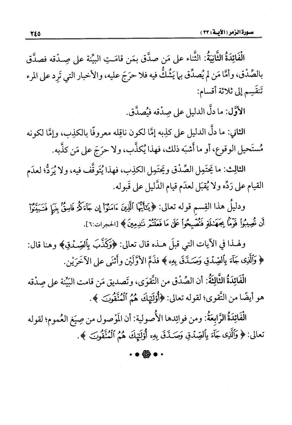 الْفَائِدَةُ الثَّالِثَةُ: أن الصِّدْق من التَّقوَى، وتَصديق مَن قامت البَيِّنة على صِدْقه هو أيضًا من التَّقوى؛ لقوله تعالى: {أُولَئِكَ هُمُ الْمُتَّقُونَ}.