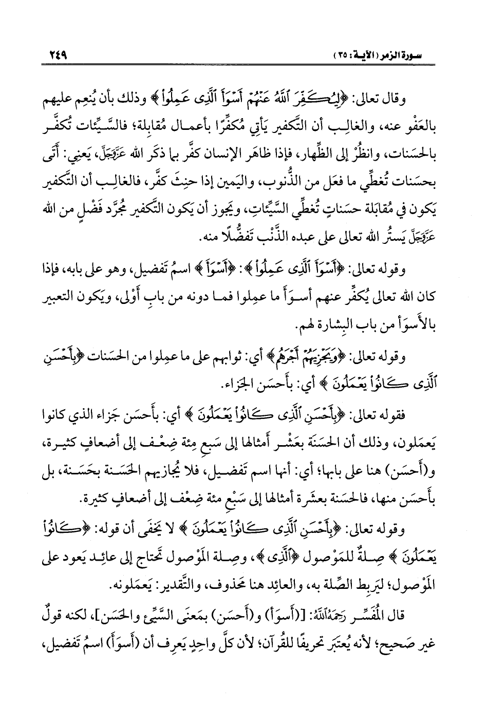 قال المُفَسِّر رَحِمَهُ اللهُ: [(أَسوَأ) و (أَحسَن) بمَعنَى السَّيِّئ والحَسَن]، لكنه قولٌ غير صَحيح؛ لأنه يُعتَبَر تحريفًا للقُرآن؛ لأن كلَّ واحِدٍ يَعرِف أن (أَسوَأَ) اسمُ تَفضيل،