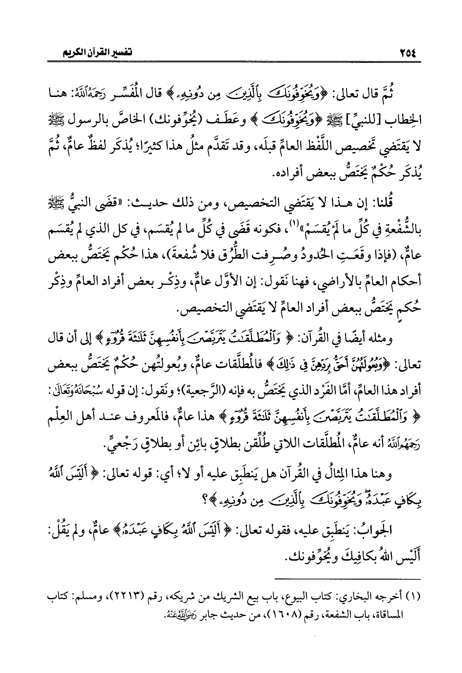 ثُمَّ قال تعالى: {وَيُخَوِّفُونَكَ بِالَّذِينَ مِنْ دُونِهِ} قال المُفَسِّر رَحِمَهُ اللهُ: هنا الخِطاب [للنبيِّ]- صلى الله عليه وسلم - {وَيُخَوِّفُونَكَ} وعَطَف (يُخوِّفونك) الخاصَّ بالرسول - صلى الله عليه وسلم - لا يَقتَضي تَخصيص اللَّفْظ العامِّ قبلَه، وقد تَقدَّم مثلُ هذا كثيرًا؛ يُذكَر لفظٌ عامٌّ، ثُمَّ يُذكَر حُكْم يَختَصُّ ببعض أفراده.