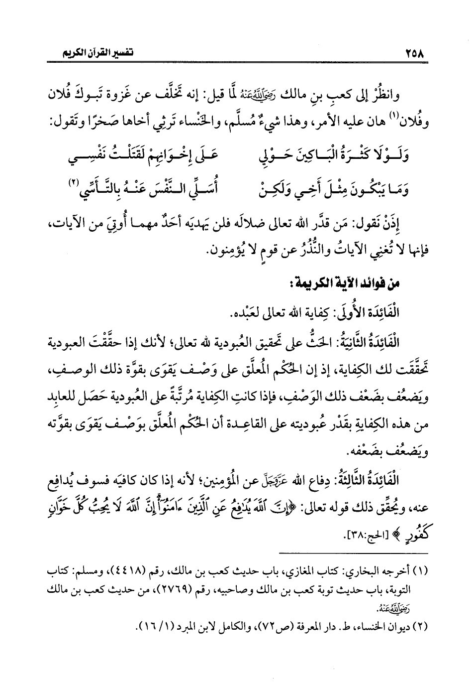 وانظُرْ إلى كعبِ بنِ مالك - رضي الله عنه - لمَّا قيل: إنه تَخلَّف عن غَزوة تَبوكَ فُلان وفُلان (١) هان عليه الأمر، وهذا شيءٌ مُسلَّم، والخَنْساء تَرثِي أخاها صَخرًا وتَقول: