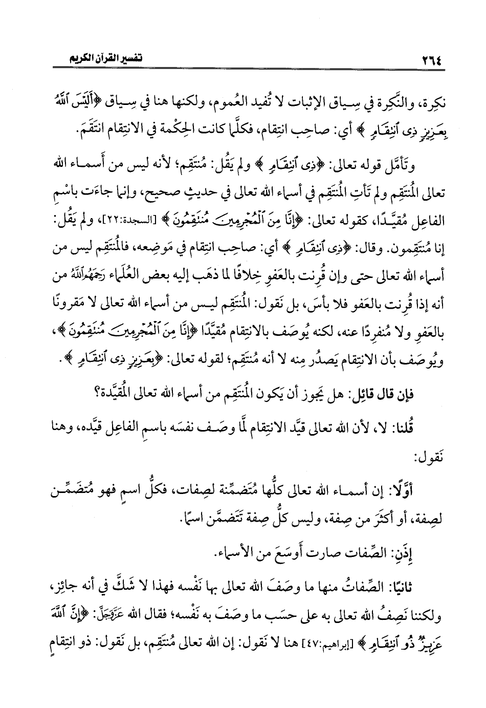 وتَأمَّل قوله تعالى: {ذِي انْتِقَامٍ} ولم يَقُل: مُنتَقِم؛ لأنه ليس من أَسماء الله تعالى المُنتَقِم ولم تَأتِ المُنتَقِم في أسماء الله تعالى في حديثٍ صحيح، وإنما جاءَت باسْمِ الفاعِل مُقيَّدًا، كقوله تعالى: {إِنَّا مِنَ الْمُجْرِمِينَ مُنْتَقِمُونَ} [السجدة: ٢٢]، ولم يَقُل: إنا مُنتَقِمون. وقال: {ذِي انْتِقَامٍ} أي: صاحِب انتِقام في مَوضِعه، فالمُنتَقِم ليس من أسماء الله تعالى حتى وإن قُرِنت بالعَفوِ خِلافًا لما ذهَب إليه بعض العُلَماء رَحِمَهُم اللهُ من أنه إذا قُرِنت بالعَفو فلا بأسَ، بل نَقول: المُنتَقِم ليس من أسماء الله تعالى لا مَقرونًا بالعَفوِ ولا مُنفرِدًا عنه، لكنه يُوصَف بالانتِقام مُقيَّدًا {إِنَّا مِنَ الْمُجْرِمِينَ مُنْتَقِمُونَ}، ويُوصَف بأن الانتِقام يَصدُر مِنه لا أنه مُنتَقِم؛ لقوله تعالى: {بِعَزِيزٍ ذِي انْتِقَامٍ}.
