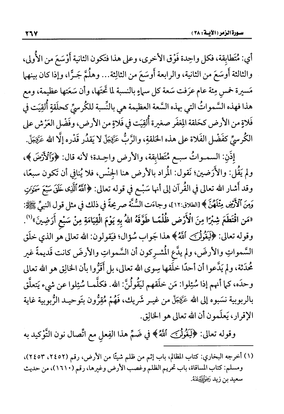 إِذَنِ: السمواتُ سبع مُتَطابِقة، والأرض واحِدة؛ لأنه قال: {وَالْأَرْضَ}، ولم يَقُل: والأَرَضين؛ نَقول: المُراد بالأرض هنا الجِنْس، فلا يُنافِي أن تَكون سبعًا، وقد أَشار الله تعالى في القُرآن إلى أنها سَبْع في قوله تعالى: {اللَّهُ الَّذِي خَلَقَ سَبْعَ سَمَاوَاتٍ وَمِنَ الْأَرْضِ مِثْلَهُنَّ} [الطلاق: ١٢]، وجاءَت السُّنَّة صريحةً في ذلك في مثل قول النبيِّ - صلى الله عليه وسلم -: "مَن اقْتَطَعَ شِبْرًا مِنَ الْأَرْض ظُلْمًا طَوَّقَهُ اللهُ بِهِ يَوْمَ الْقِيَامَةِ مِنْ سَبْعِ أَرَضِينَ" (١).