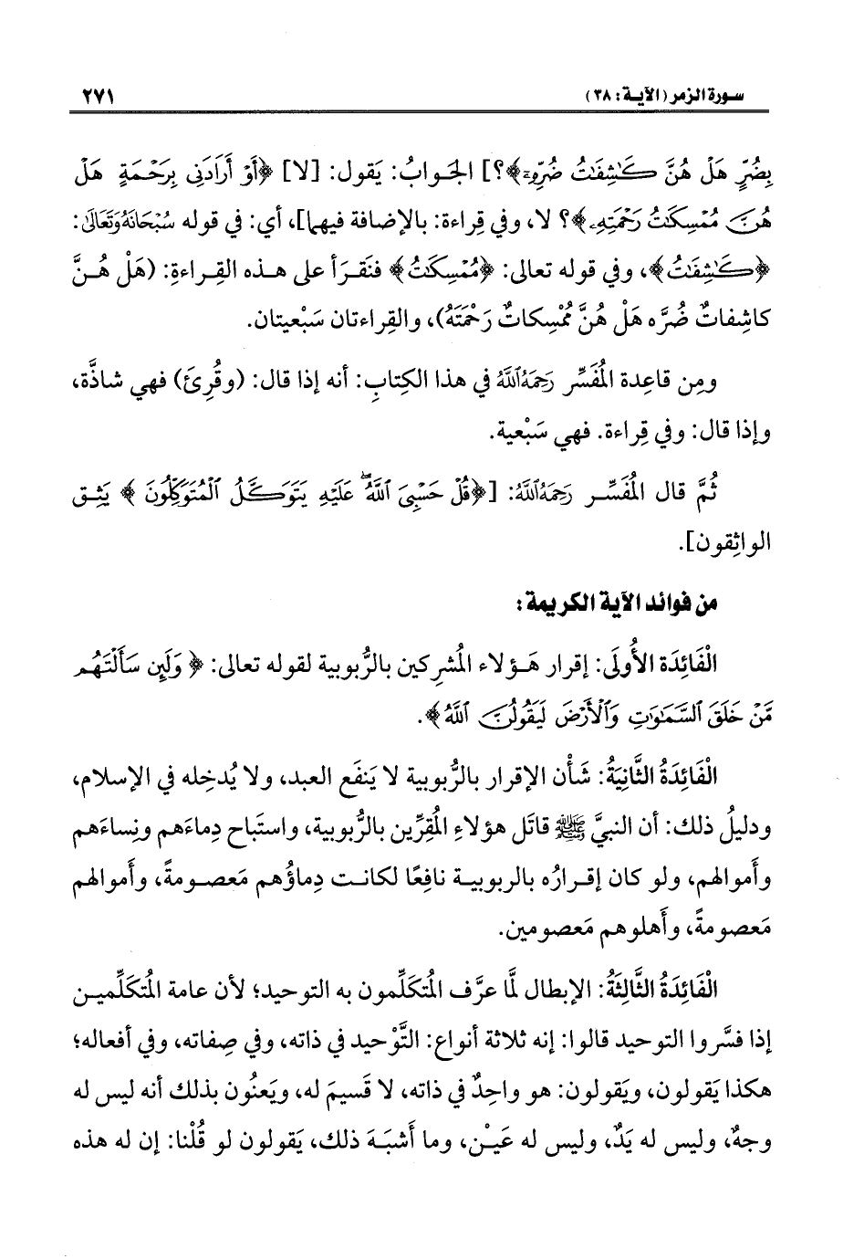 بِضُرٍّ هَلْ هُنَّ كَاشِفَاتُ ضُرِّهِ}؟] الجَوابُ: يَقول: [لا] {أَوْ أَرَادَنِي بِرَحْمَةٍ هَلْ هُنَّ مُمْسِكَاتُ رَحْمَتِهِ}؟ لا، وفي قِراءة: بالإضافة فيهما]، أي: في قوله سُبْحَانَهُ وَتَعَالَى: {كَاشِفَاتُ}، وفي قوله تعالى: {مُمْسِكَاتُ} فنَقرَأ على هذه القِراءةِ: (هَلْ هُنَّ كاشِفاتٌ ضُرَّه هَلْ هُنَّ مُمْسِكاتٌ رَحْمَتَهُ)، والقِراءتان سَبْعيتان.