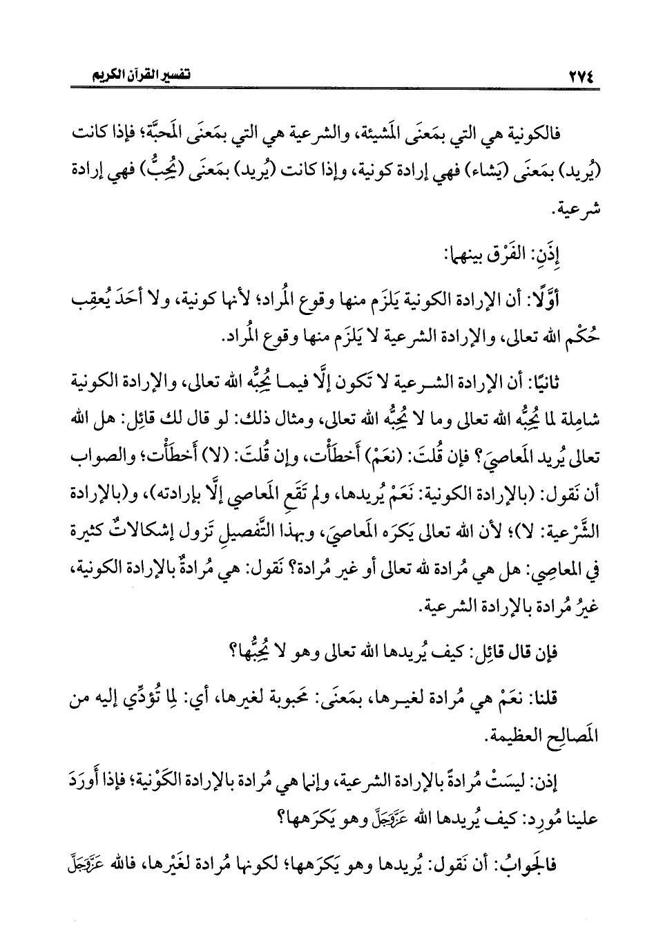 ثانيًا: أن الإرادة الشرعية لا تَكون إلَّا فيما يُحِبُّه الله تعالى، والإرادة الكونية شامِلة لما يُحِبُّه الله تعالى وما لا يُحِبُّه الله تعالى، ومثال ذلك: لو قال لك قائِل: هل الله تعالى يُريد المَعاصيَ؟ فإن قُلتَ: (نعَمْ) أَخطَأْت، وإن قُلتَ: (لا) أَخطَأْت؛ والصواب أن نَقول: (بالإرادة الكونية: نَعَمْ يُريدها، ولم تَقَعِ المَعاصي إلَّا بإرادته)، و (بالإرادة الشَّرْعية: لا)؛ لأن الله تعالى يَكرَه المَعاصيَ، وبهذا التَّفصيلِ تَزول إشكالاتٌ كثيرة في المعاصِي: هل هي مُرادة لله تعالى أو غير مُرادة؟ نَقول: هي مُرادةٌ بالإرادة الكونية، غيرُ مُرادة بالإرادة الشرعية.